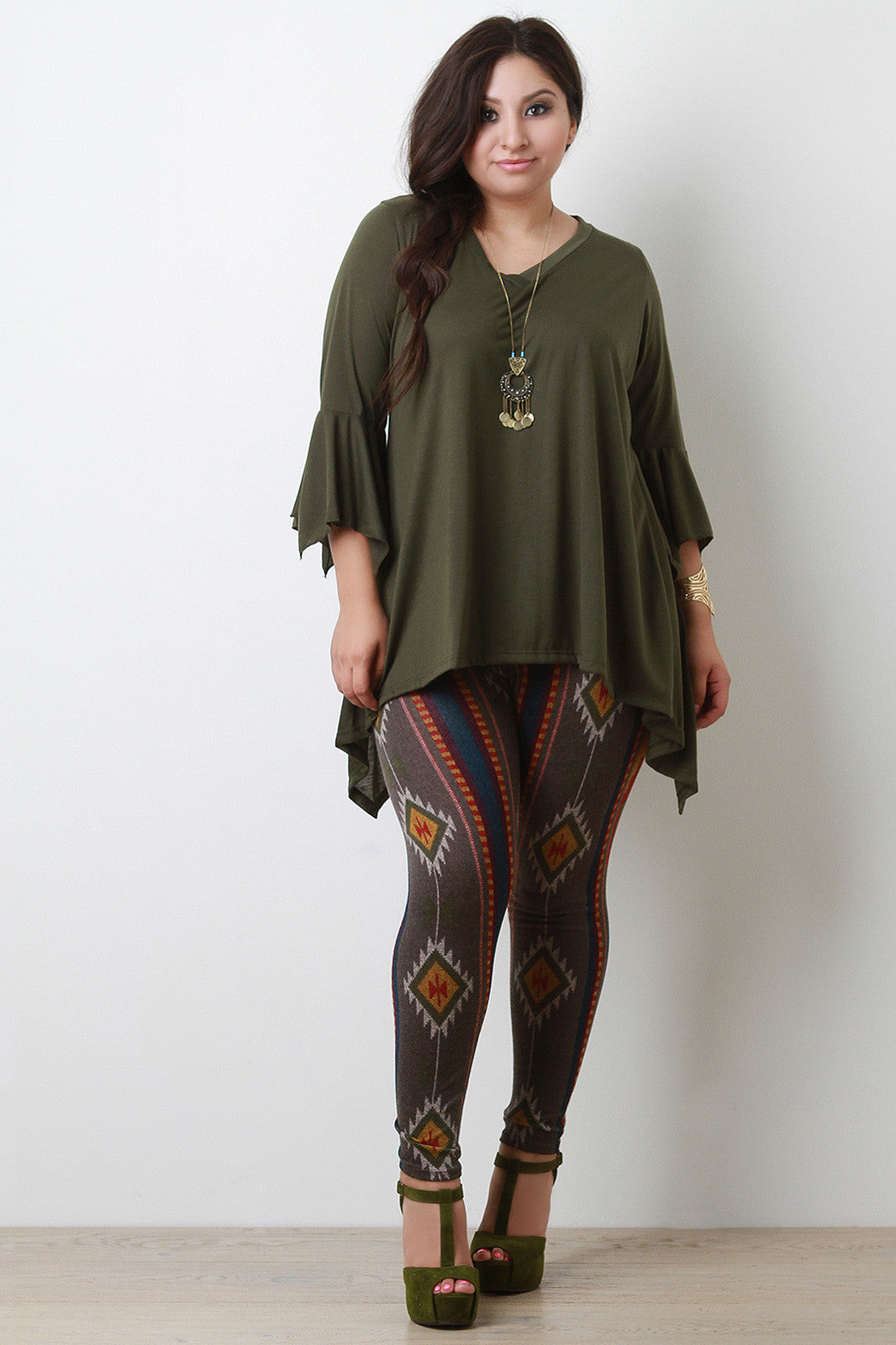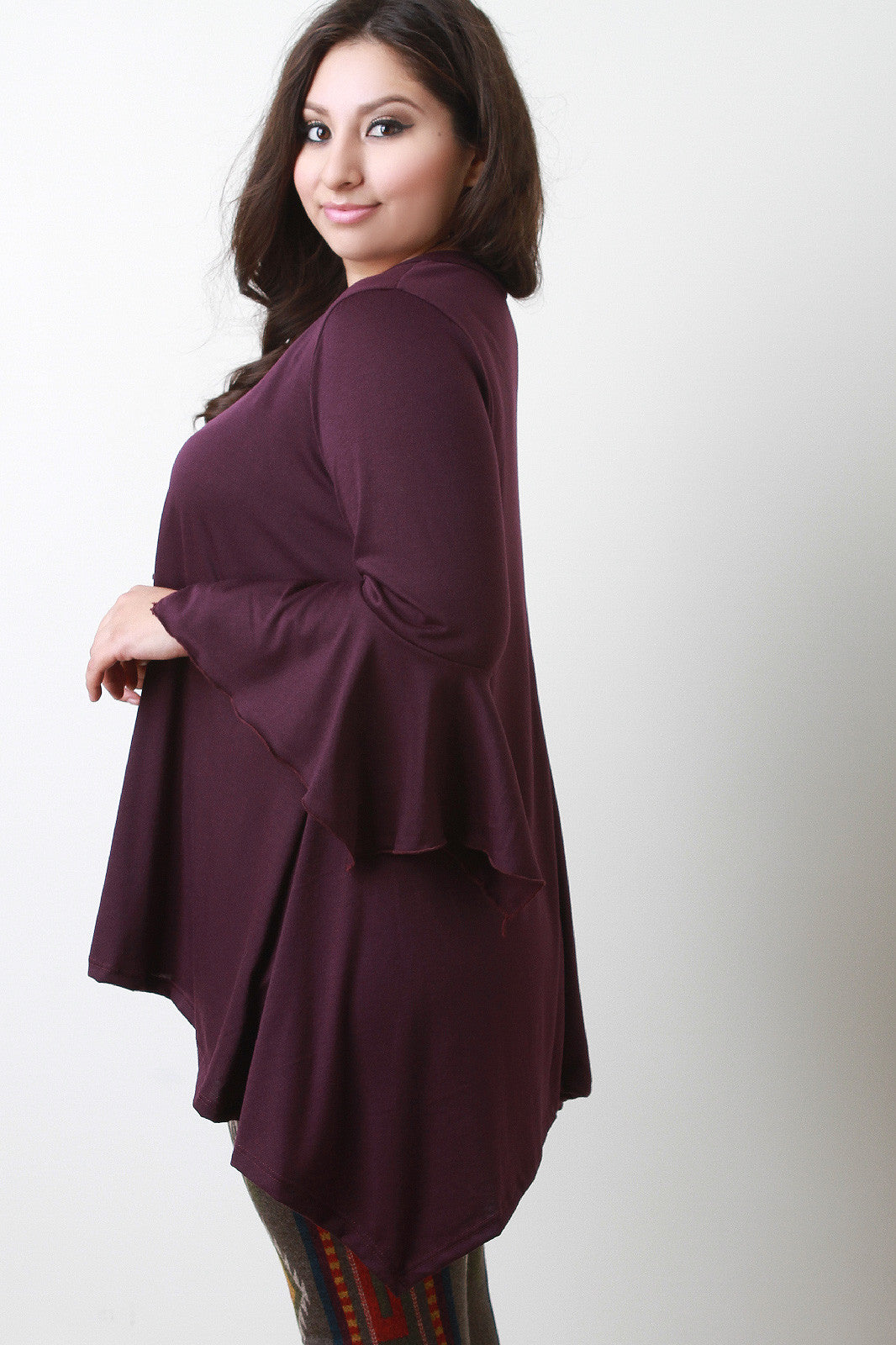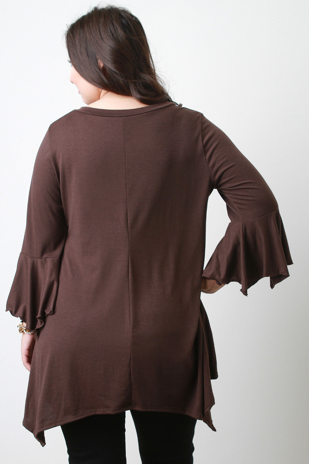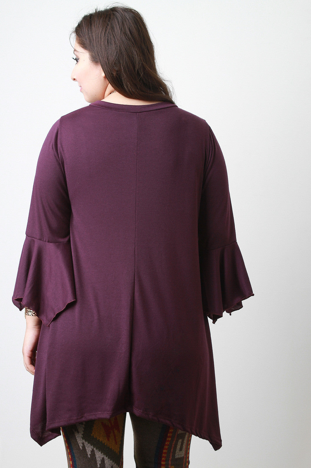 This effortless plus size top features a v neckline, long bell sleeves, and finished with asymmetrical sharkbite hemline. Accessories sold separately. Made in U.S.A. 87% Polyester, 10% Rayon, 3% Spandex.