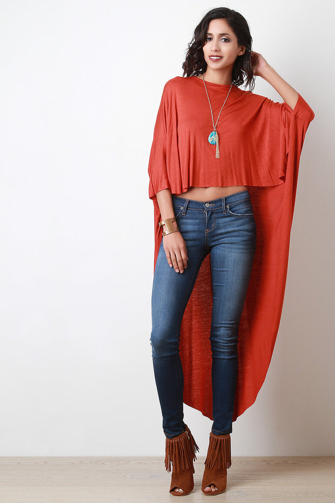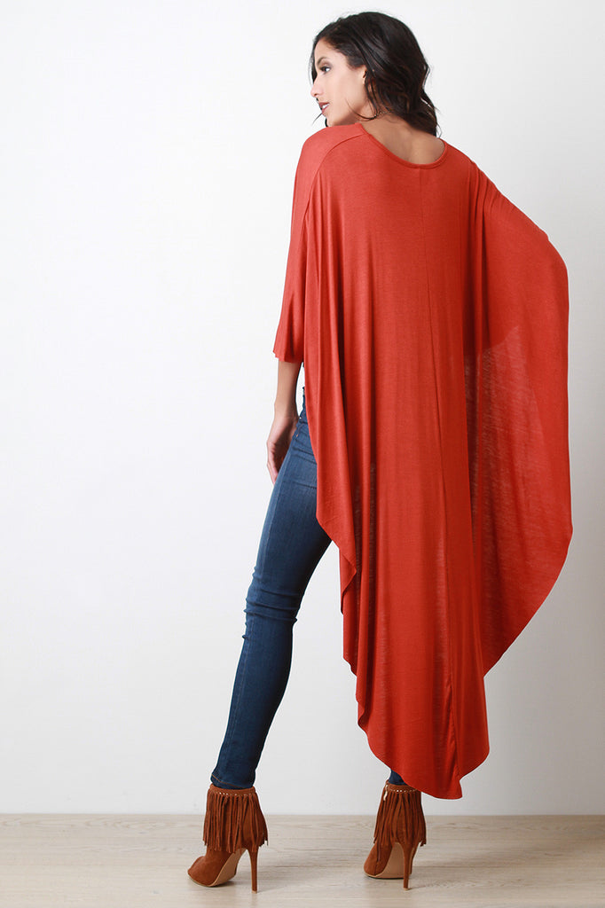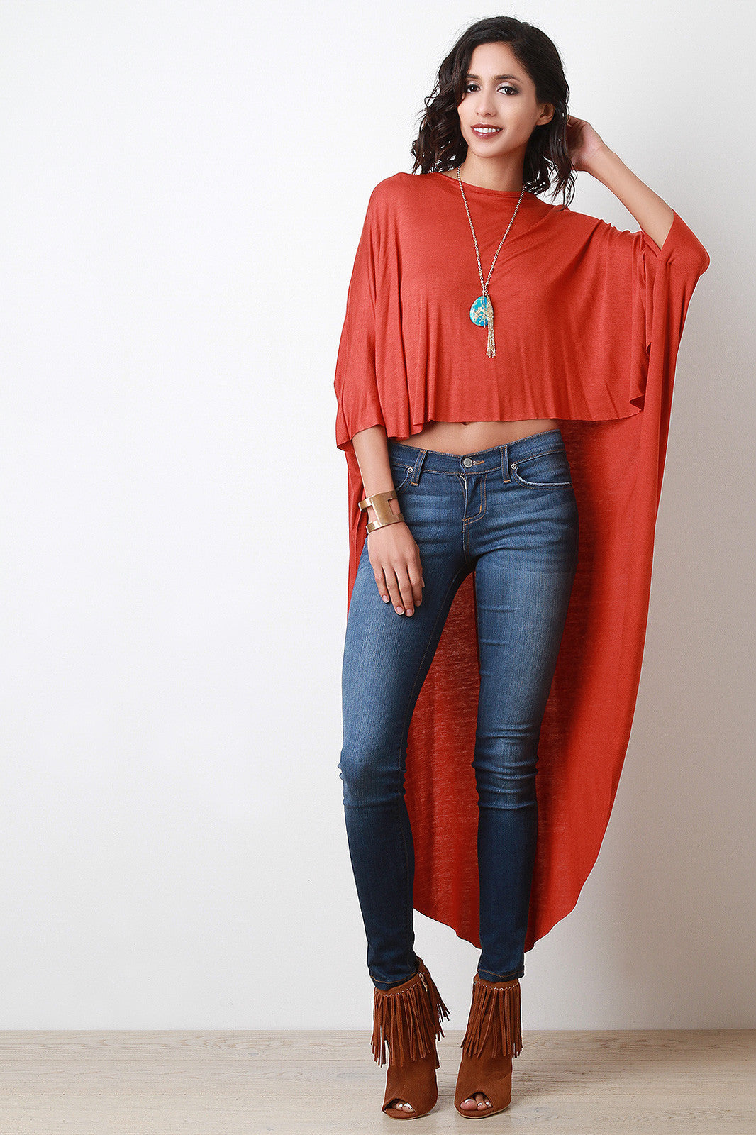 This cape top features soft jersey knit, round neckline, dolman sleeves, and finished with high-low hem. Accessories sold separately. Made in U.S.A. 96% Rayon, 4% Spandex.