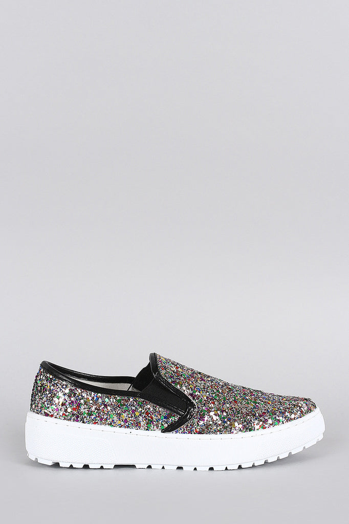 This shimmery sneaker features a multicolor glitter upper, double elastic gusset insert, flatform heel, cushioned insole, and easy slip on construction.