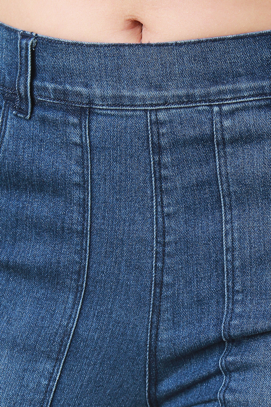 These bell bottom denim jeans features a high rise waist, side zipper fastener to a single button closure, belt loops, rectangular pockets, rear pockets, and flare cut fit. Accessories sold separately. 98% Cotton, 2% Spandex.