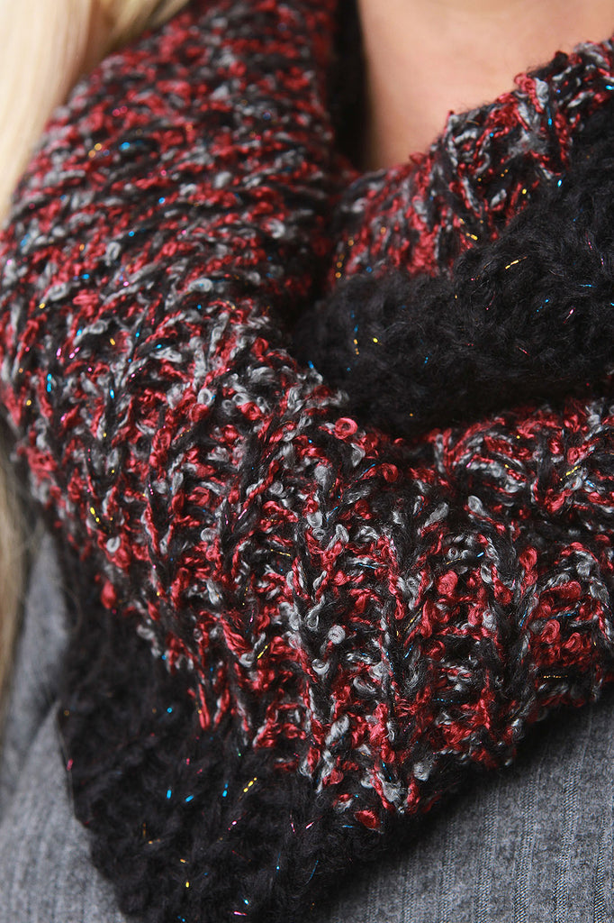 A loose ribbed knit infinity scarf featuring two-tone center design with colorful metallic thread throughout. 100% Acrylic.
