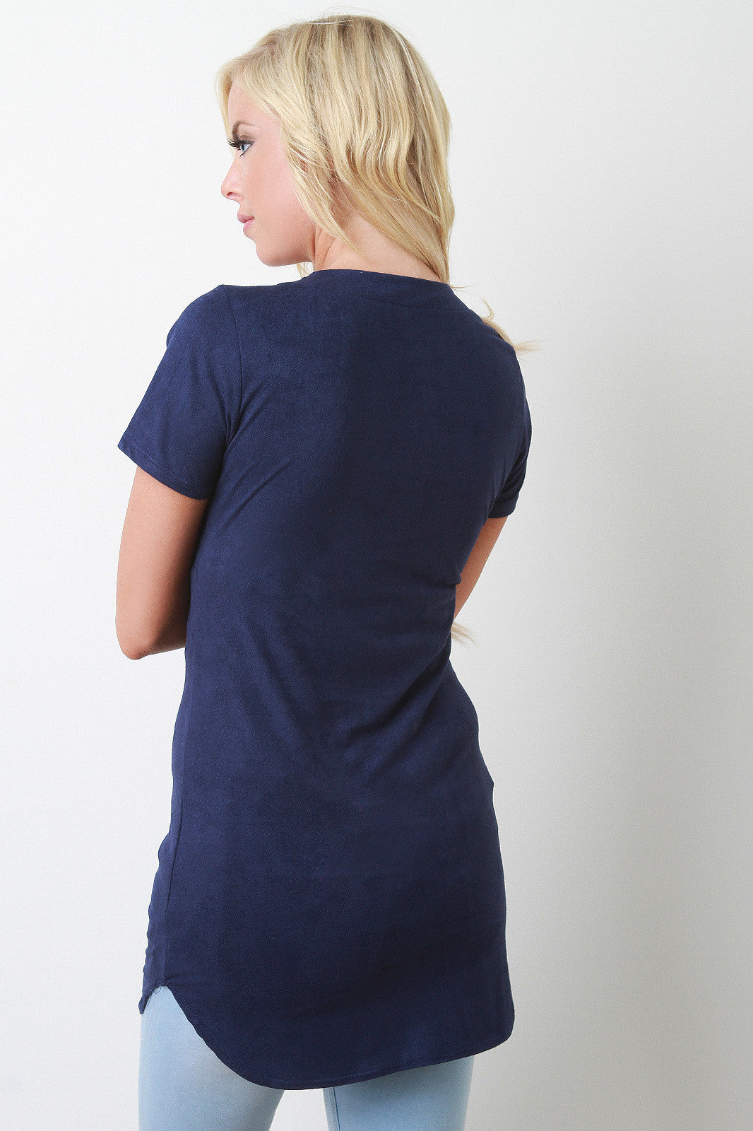 This vegan suede top features a v-neckline with lace up front, short sleeves, and a rounded hemline. Accessories sold separately. Made in U.S.A. 95% Polyester, 5% Spandex.