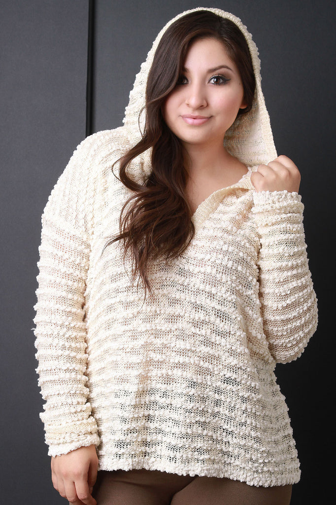 A semi-sheer plus size sweater featuring loose boucle knit, ribbed v-neckline with hood, and dropped shoulders with long sleeves. Accessories sold separately. 50% Acrylic, 50% Polyester.