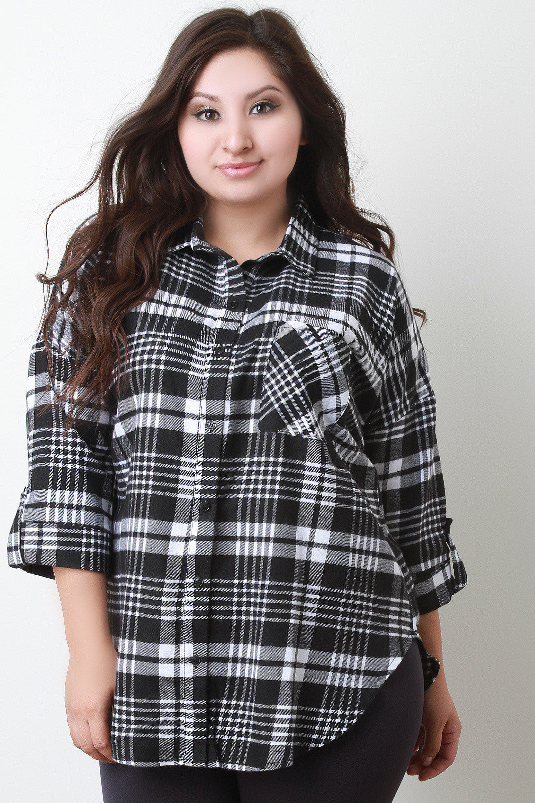 This plus size flannel top features a button up front to a classic collar neckline, left breast pocket, quarter-length sleeves, and a shirt tail hemline. Accessories sold separately. Made in U.S.A. 35% Polyester, 70% Cotton.