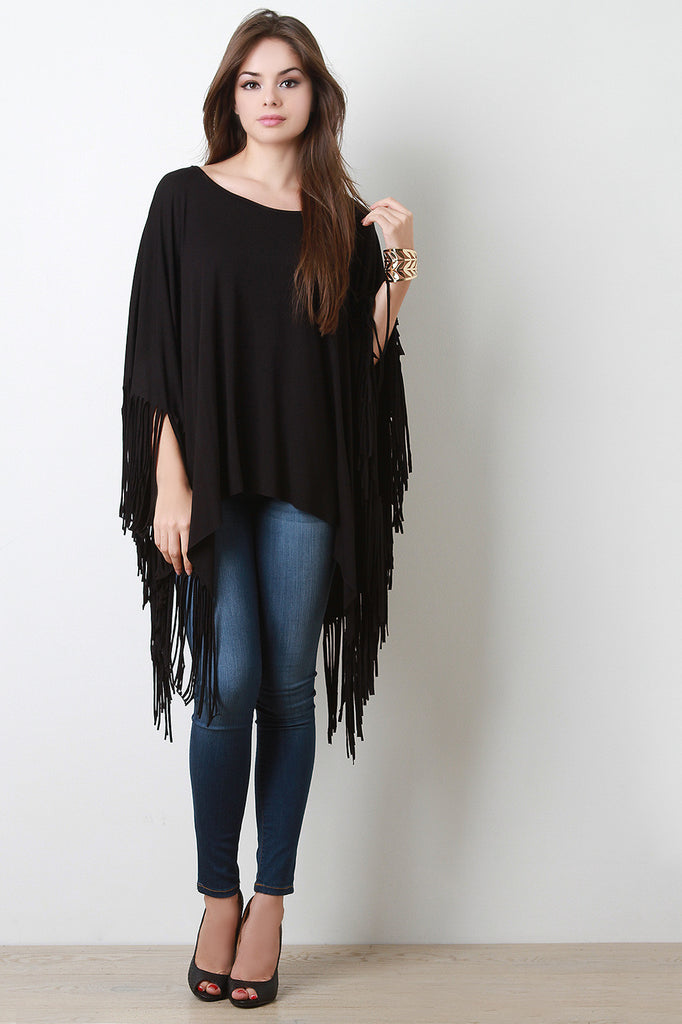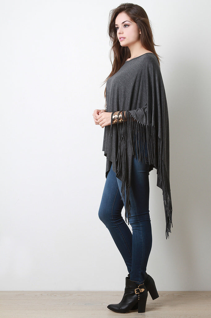 Jersey Knit Fringe Handkerchief Hem Poncho