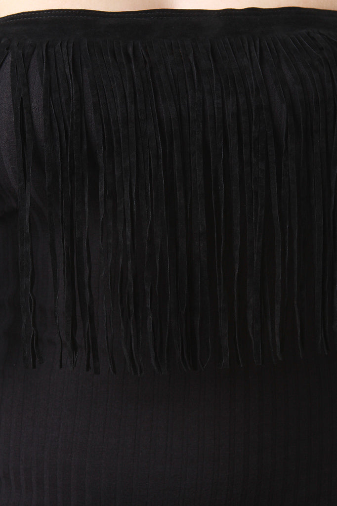 Ribbed Knit Suede Fringe Tube Midi Dress