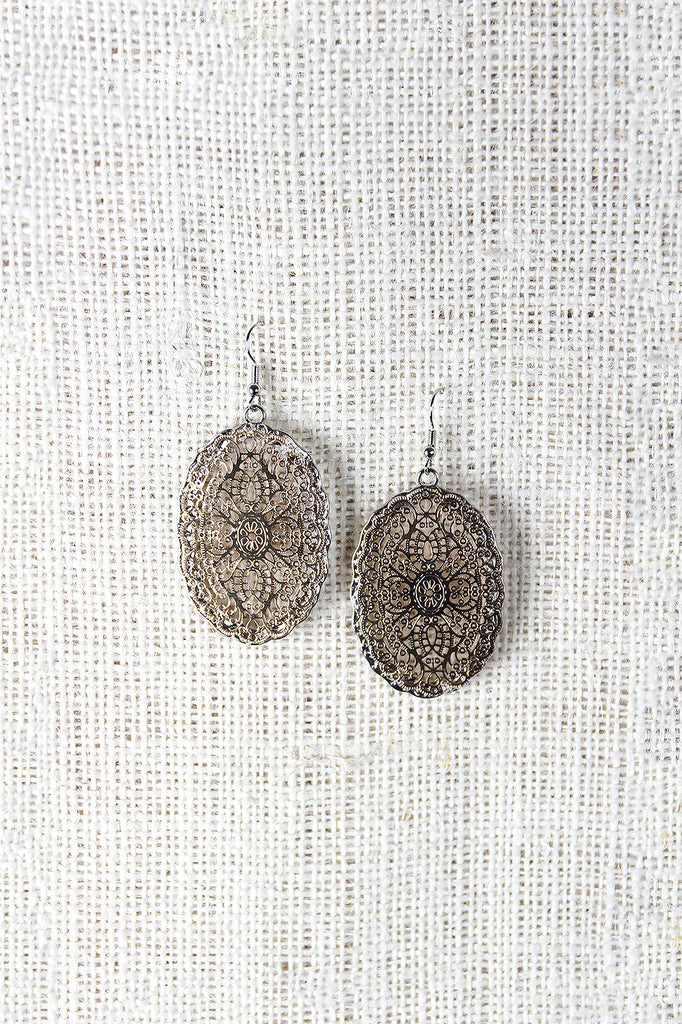 This pair of earrings features an oval shape with an extra layer of metal around the edges of the back of the earring creating a 3-D effect.