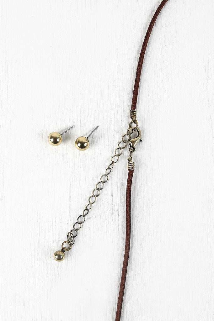This necklace features a suede cord with beads at the end tying together the two vegan leather feathers painted with leaf-like detail.