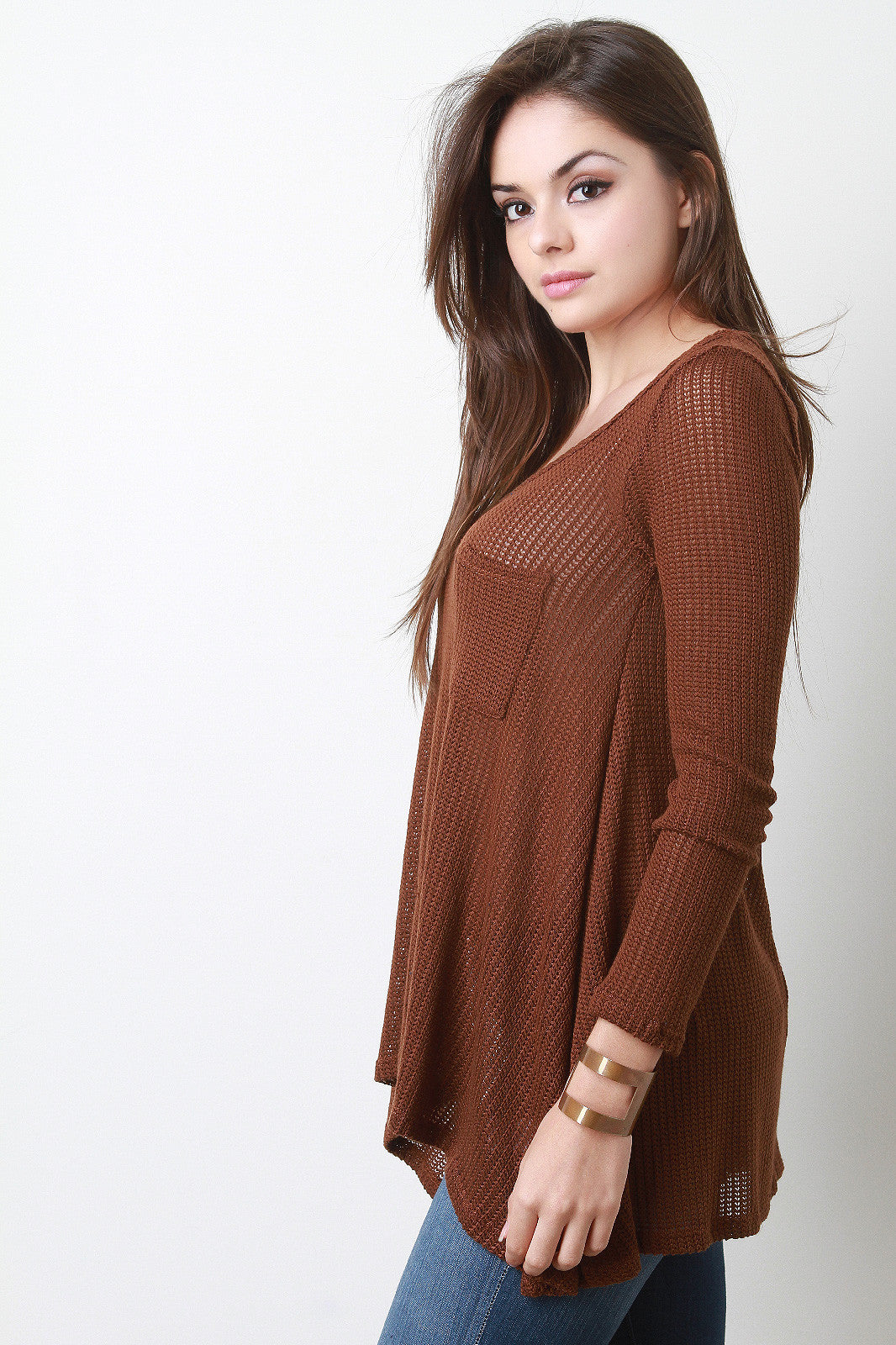 This loose knit sweater top features a scooped round neckline, long sleeves, and a trapeze hemline. Finished with a single left breast pocket. Accessories sold separately. Made in U.S.A. 64% Polyester, 34% Rayon, 2% Spandex.