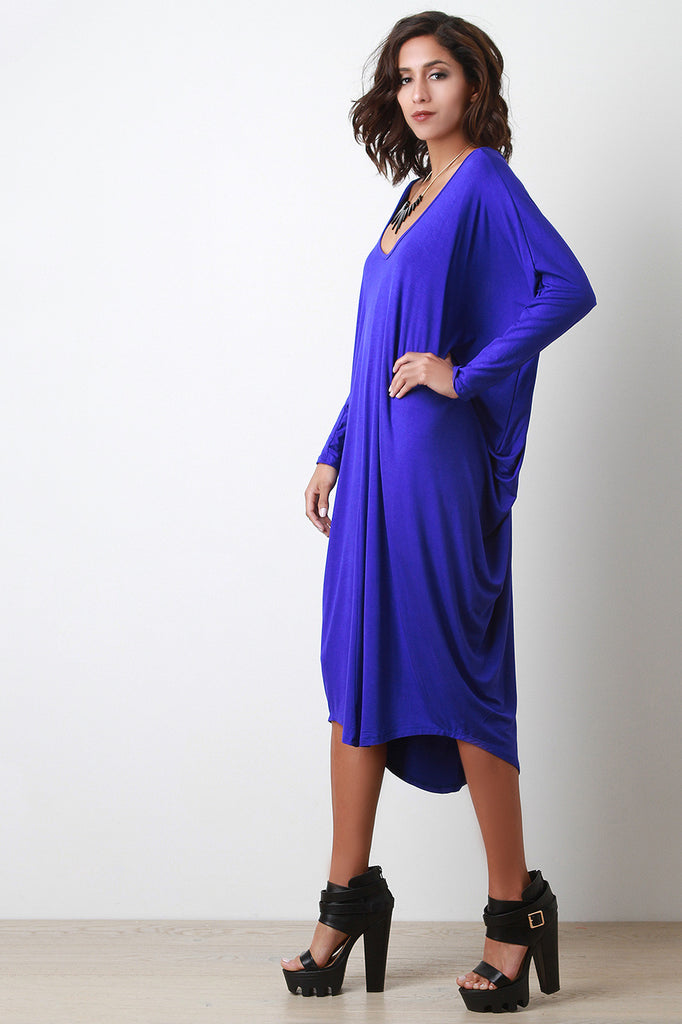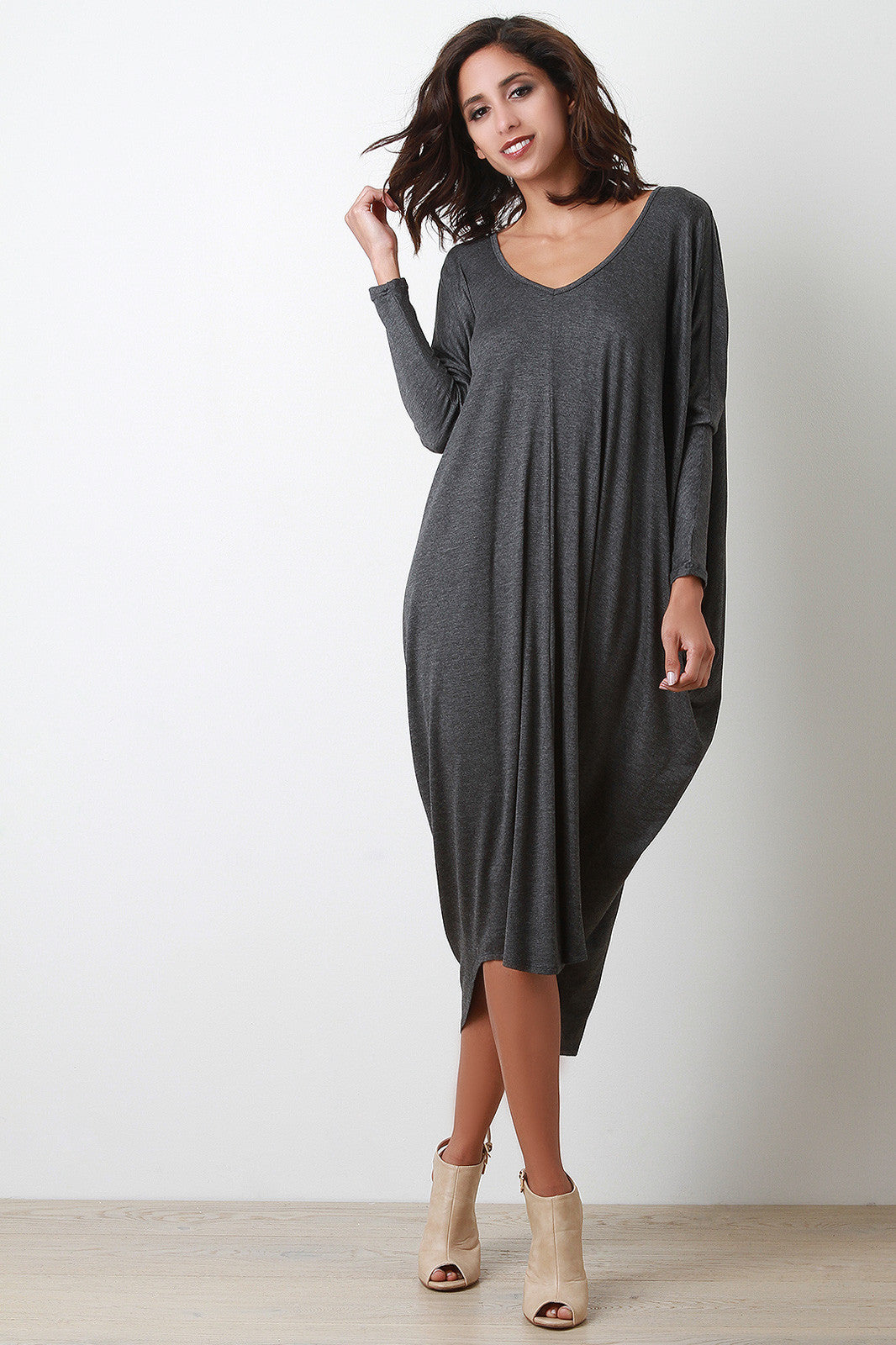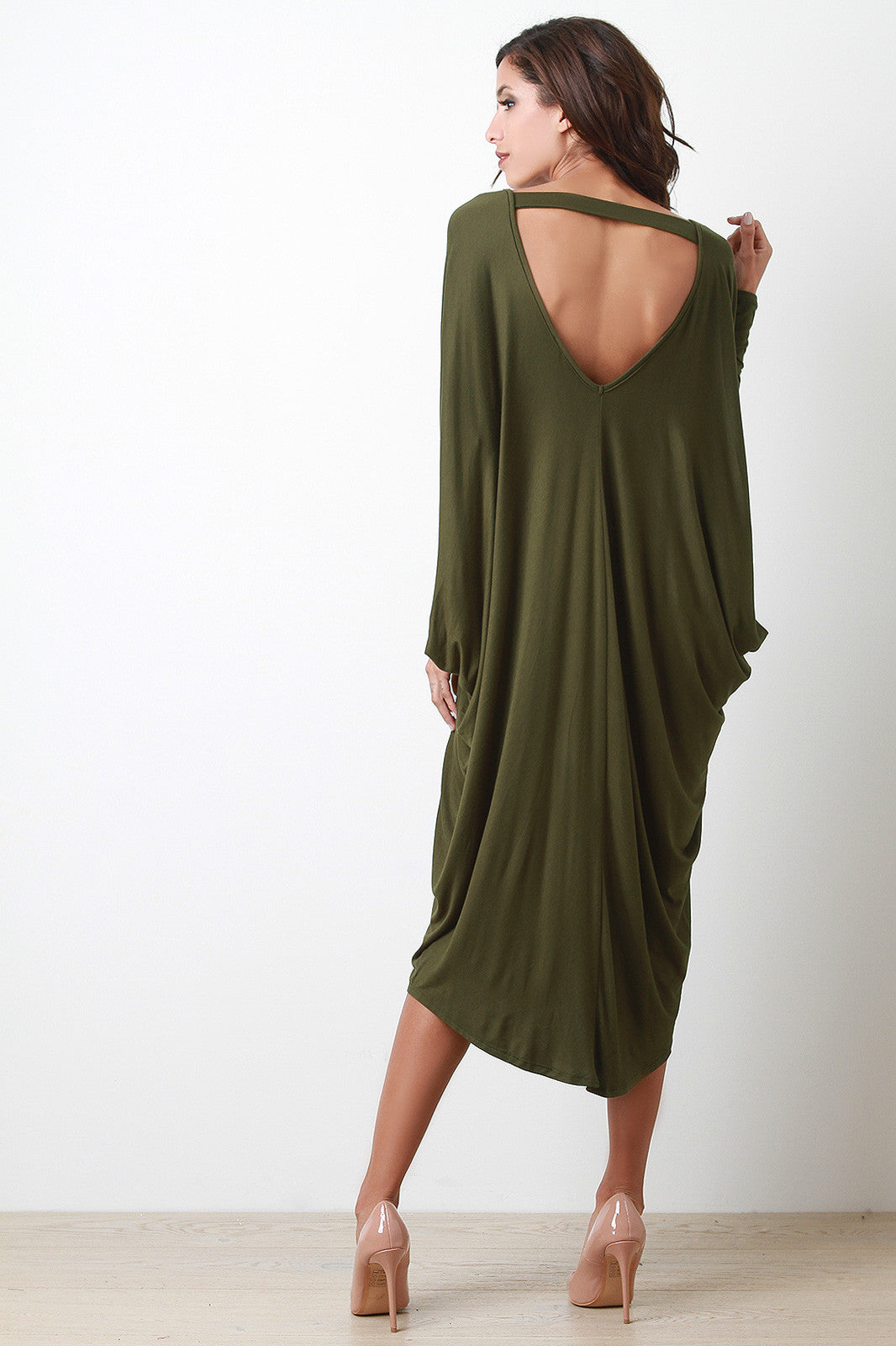 This loose-fit midi dress features solid color jersey knit, a plunging  v-neckline, and long dolman sleeves. Finished with a large keyhole back. Accessories sold separately. Made in U.S.A. 96% Rayon, 4% Spandex.