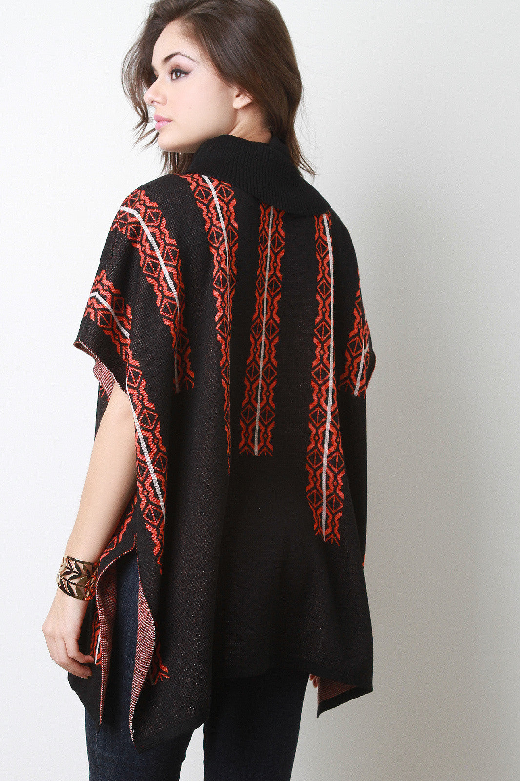 This poncho top features thick knit, tribal design, rib knit turtle neck, arm openings, and side slits. Accessories sold separately. Self: 100% Polyester.