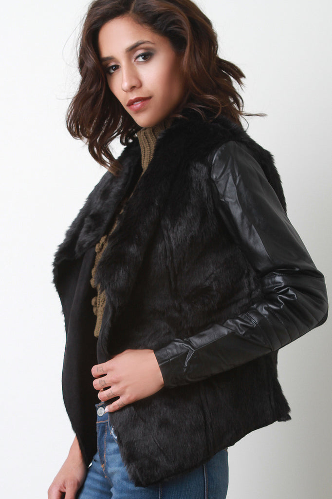 This jacket features soft faux fur, open front, long vegan leather sleeves with quilted panel and rib knit accent. Accessories sold separately. 100% Polyester.