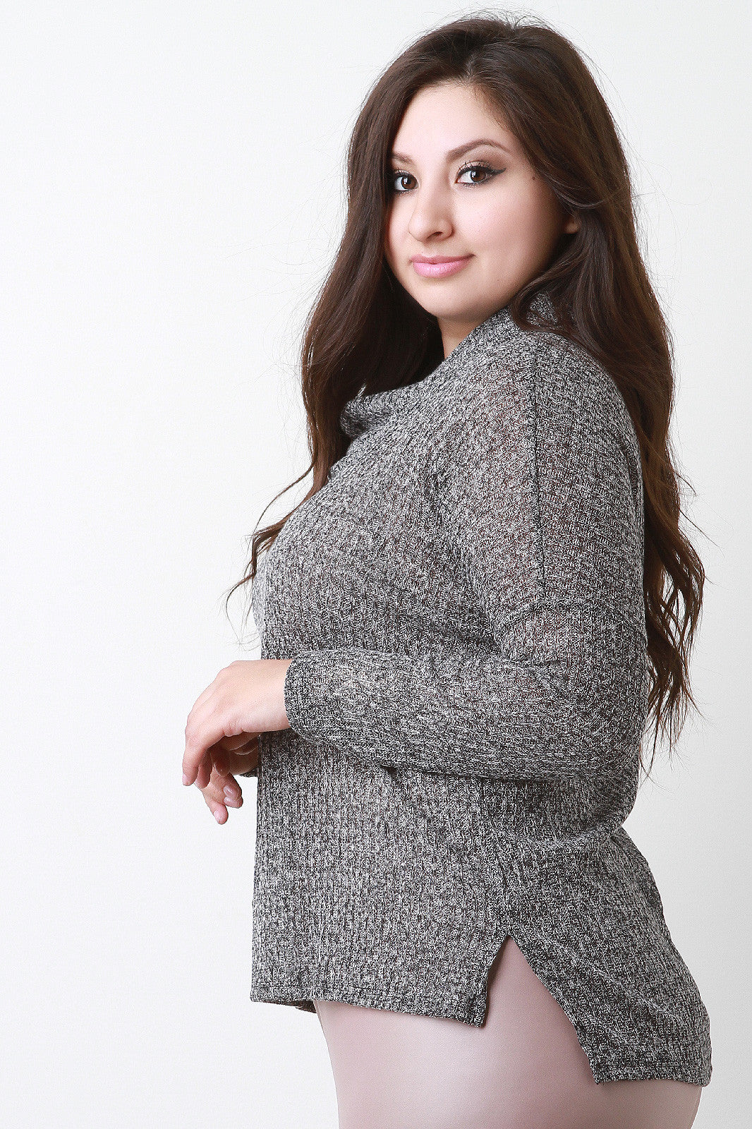 This plus size top features a marled knit fabrication, cowl neckline, long sleeves, double side slits, and high-low hemline. Accessories sold separately. Made in U.S.A. 47% Polyester, 47% Rayon, 6% Spandex.
