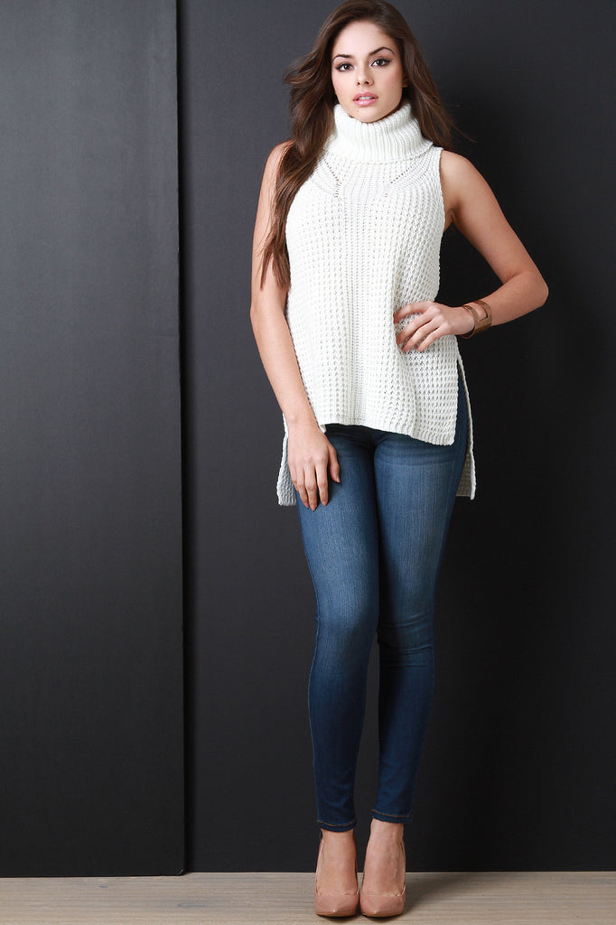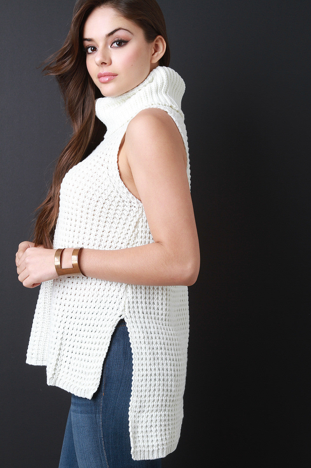 This sleeveless top features a knit pattern construction, turtle neckline, asymmetrical hemline, and vent slits at sides. Accessories sold separately. 60% Cotton, 40% Acrylic.