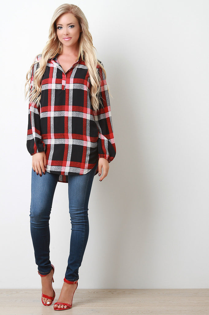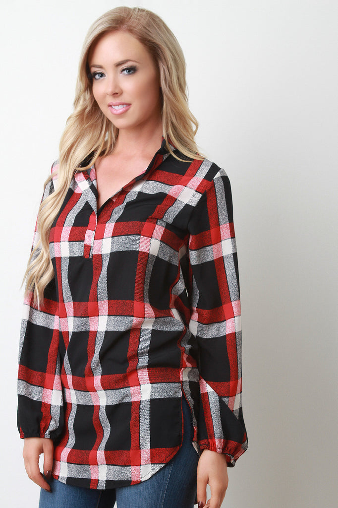 A lightweight plaid pattern throughout, a splayed mandarin collar, and long sleeves with elasticized cuffs. Finished with a high-low rounded shirt hem. Accessories sold separately. Made in U.S.A. 100% Polyester.