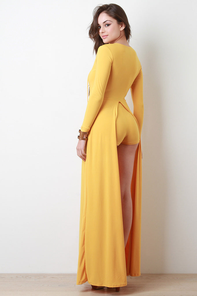 A maxi romper featuring a corset lace up v-neckline, long sleeves, and long side tiers with shorts layer underneath. Accessories sold separately. Made in U.S.A. 95% Polyester, 5% Spandex.