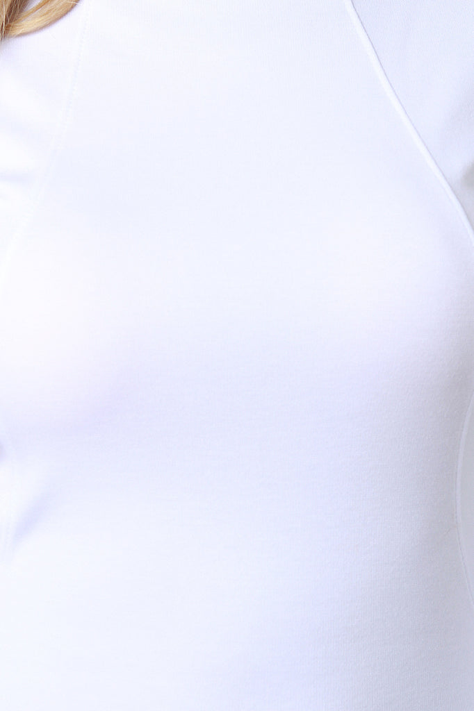 A bodycon midi dress featuring solid stretch fabric with flattering illusion seams, a short funnel neck, and long sleeves. Finished with metallic back zipper closure. Accessories sold separately. Made in U.S.A. 67% Viscose, 28% Nylon, 5% Spandex.