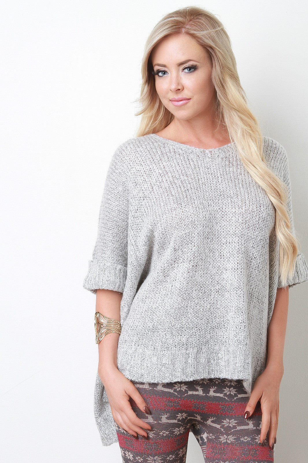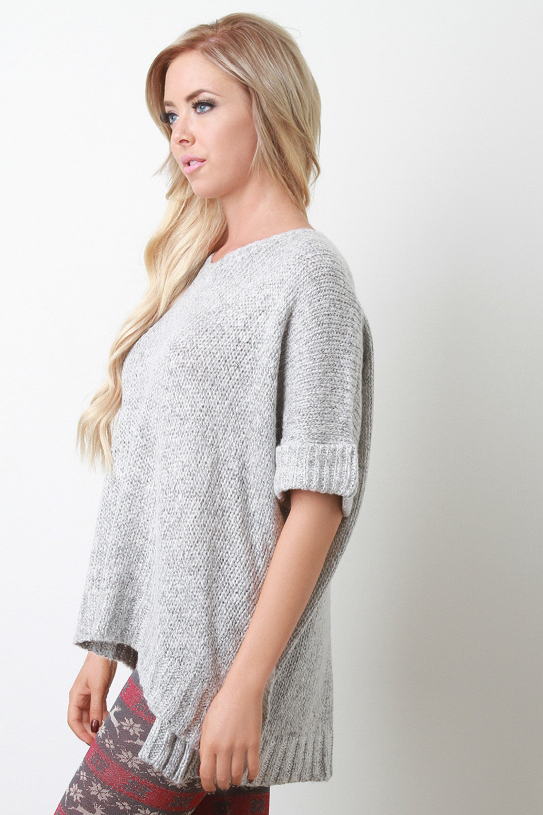This boxy top features a marled knit fabrication, round neckline, short sleeves with cuff hem, side slits, and high-low hemline. Accessories sold separately. 60% Acrylic, 20% Polyester, 20% Polyamide.