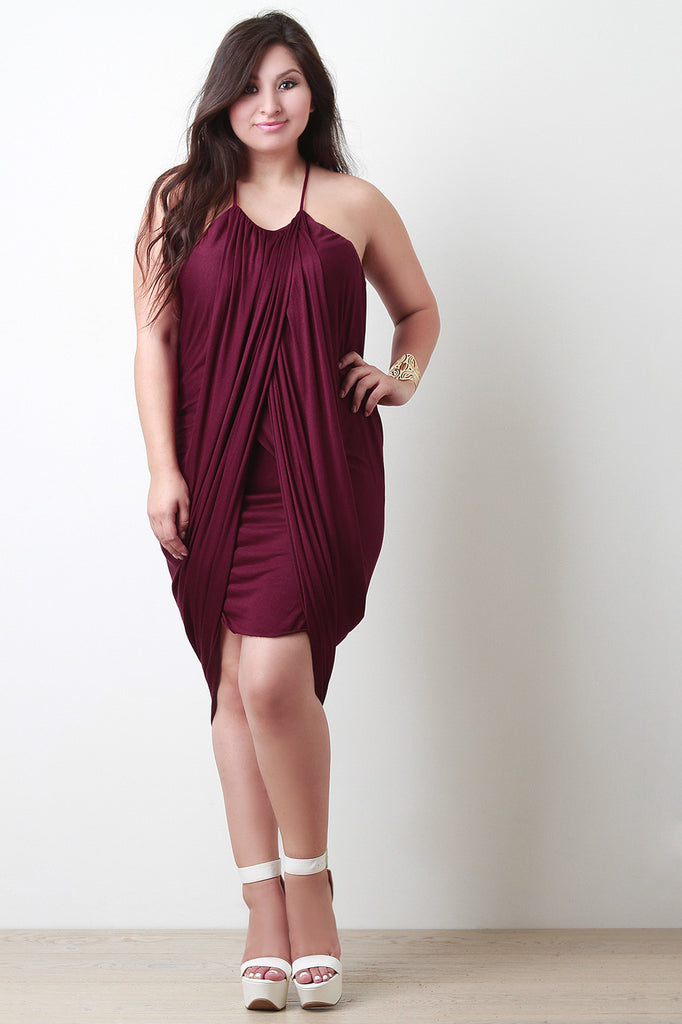 This plus size jersey dress features thin shoulder straps with a round gathered neckline, draping tulip design, a mini skirt under layer. Dress ends at a midi length hem. Fully lined. Accessories sold separately. Made in U.S.A. 95% Rayon, 5% Spandex.