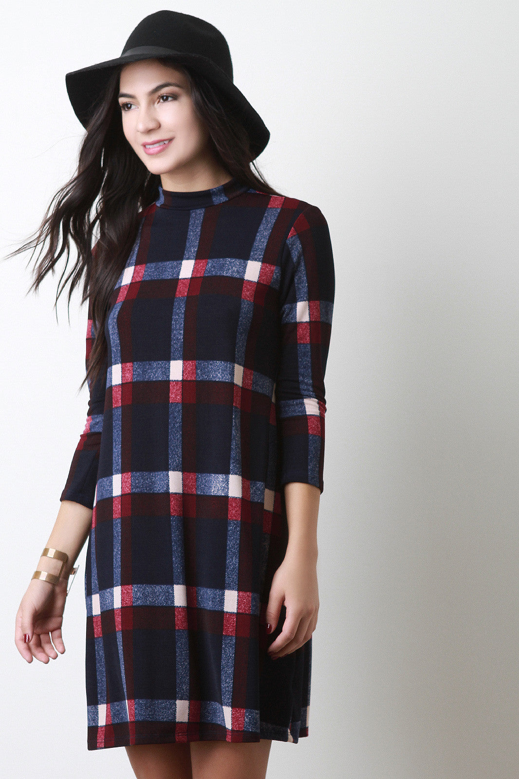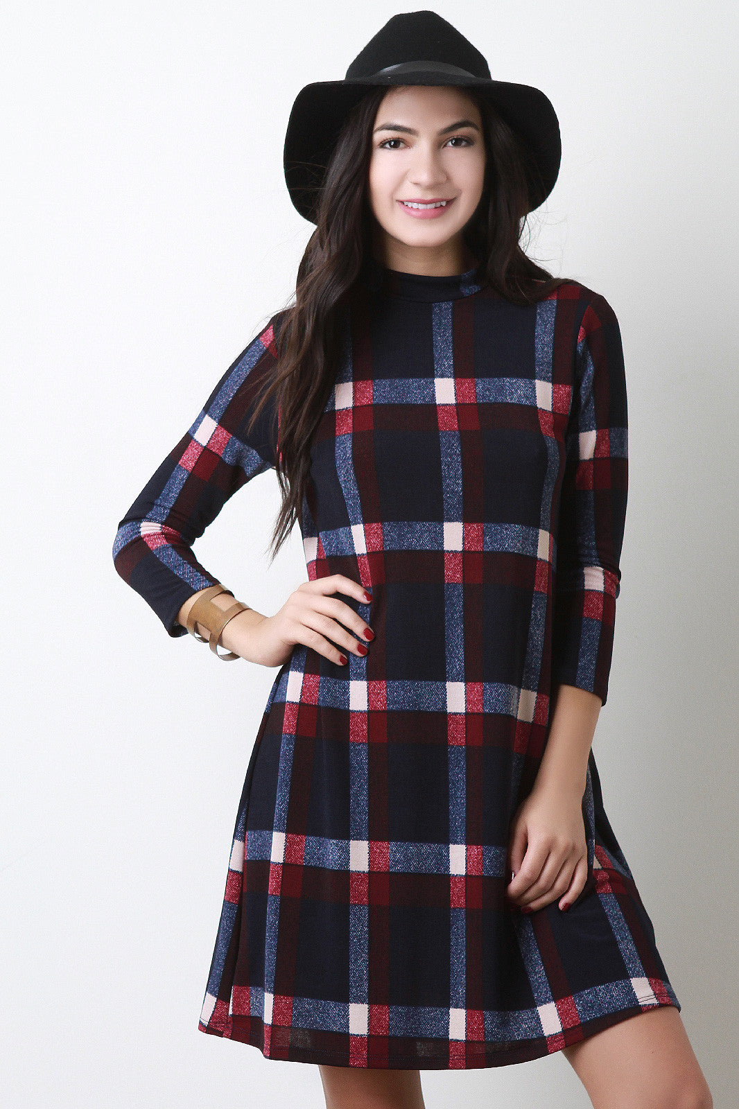 A plaid pattern knit, mock neck, and three-quarters sleeves. Accessories sold separately. Made in U.S.A. 94% Rayon, 6% Spandex.