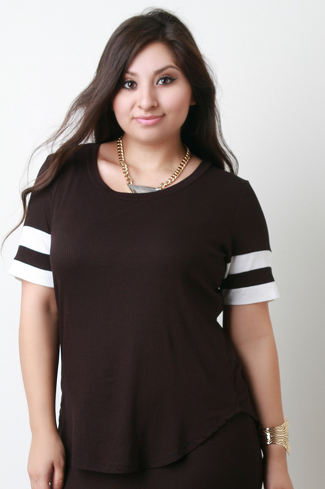 This plus size top features a ribbed jersey knit, a round crew neck, and short sleeves with wide athletic stripes. Finished with a round hem. Accessories sold separately. Made in U.S.A. 97% Rayon, 3% Spandex.