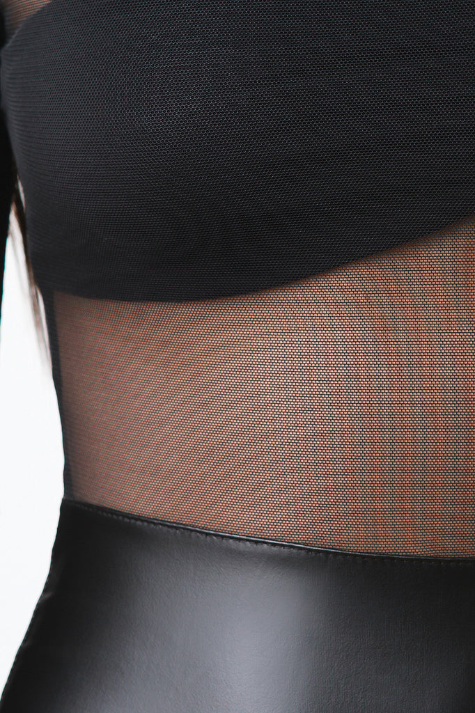 This combo dress features a semi-sheer mesh upper half, mock neckline, long sleeves, zipper fastener back, high waist seam to a sculpture fit vegan leather midi skirt bottom half. Accessories sold separately. Made in U.S.A. 88% Polyester, 12% Spandex.