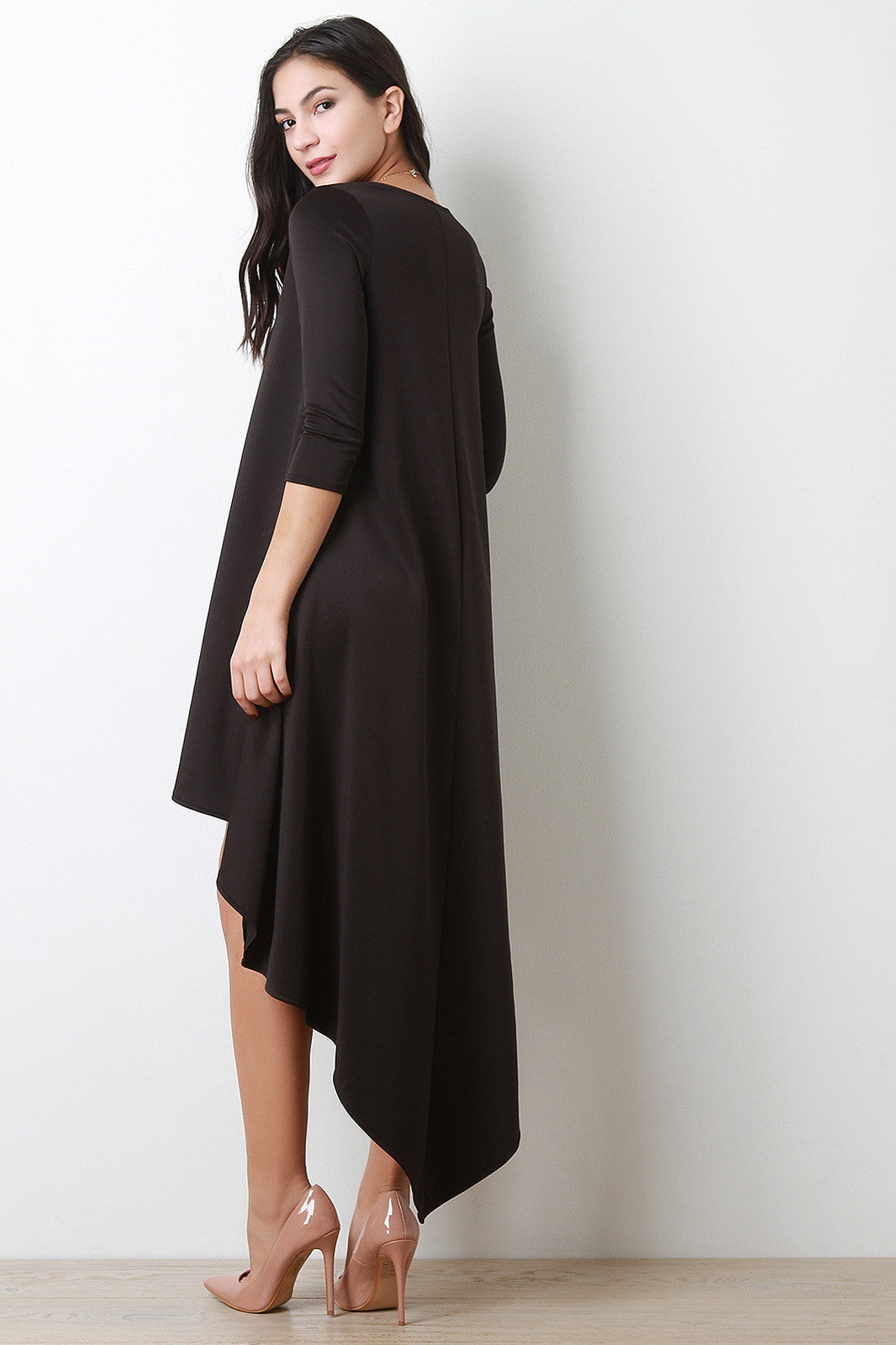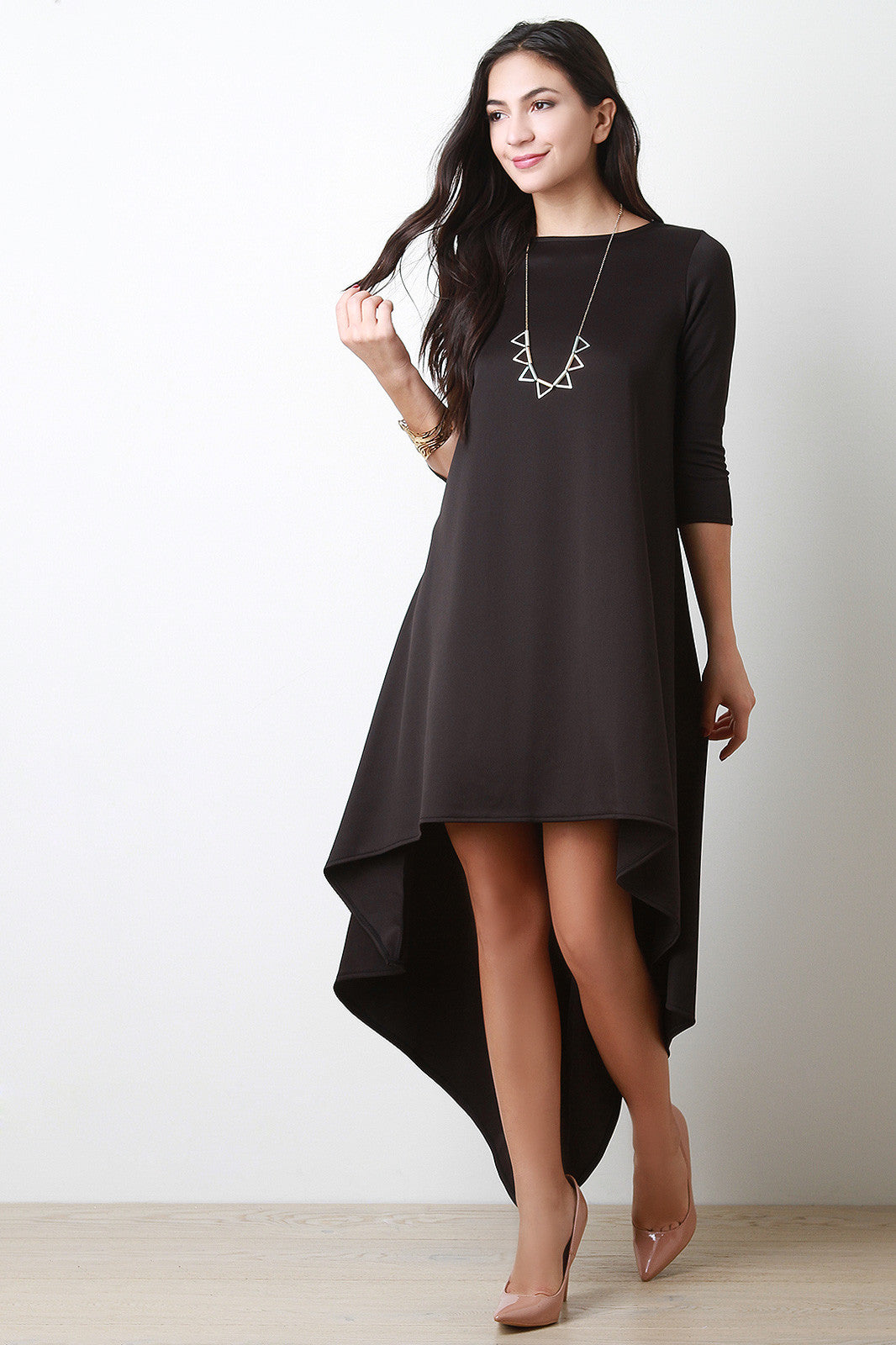 This dress features a high round neckline, quarter-length sleeves, slightly flare cut fit, and a high low hemline. Accessories sold separately. Made in U.S.A. 90% Polyester, 10% Spandex.