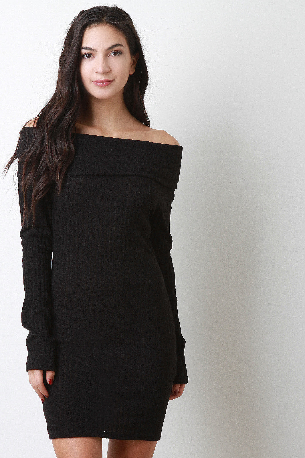 An off-the-shoulder dress featuring ribbed sweater knit, foldover top, and long sleeves. Finished with a stretchy sculpture fit and mini-length hem. Accessories sold separately. Made in U.S.A. 96% Polyester, 4% Spandex.