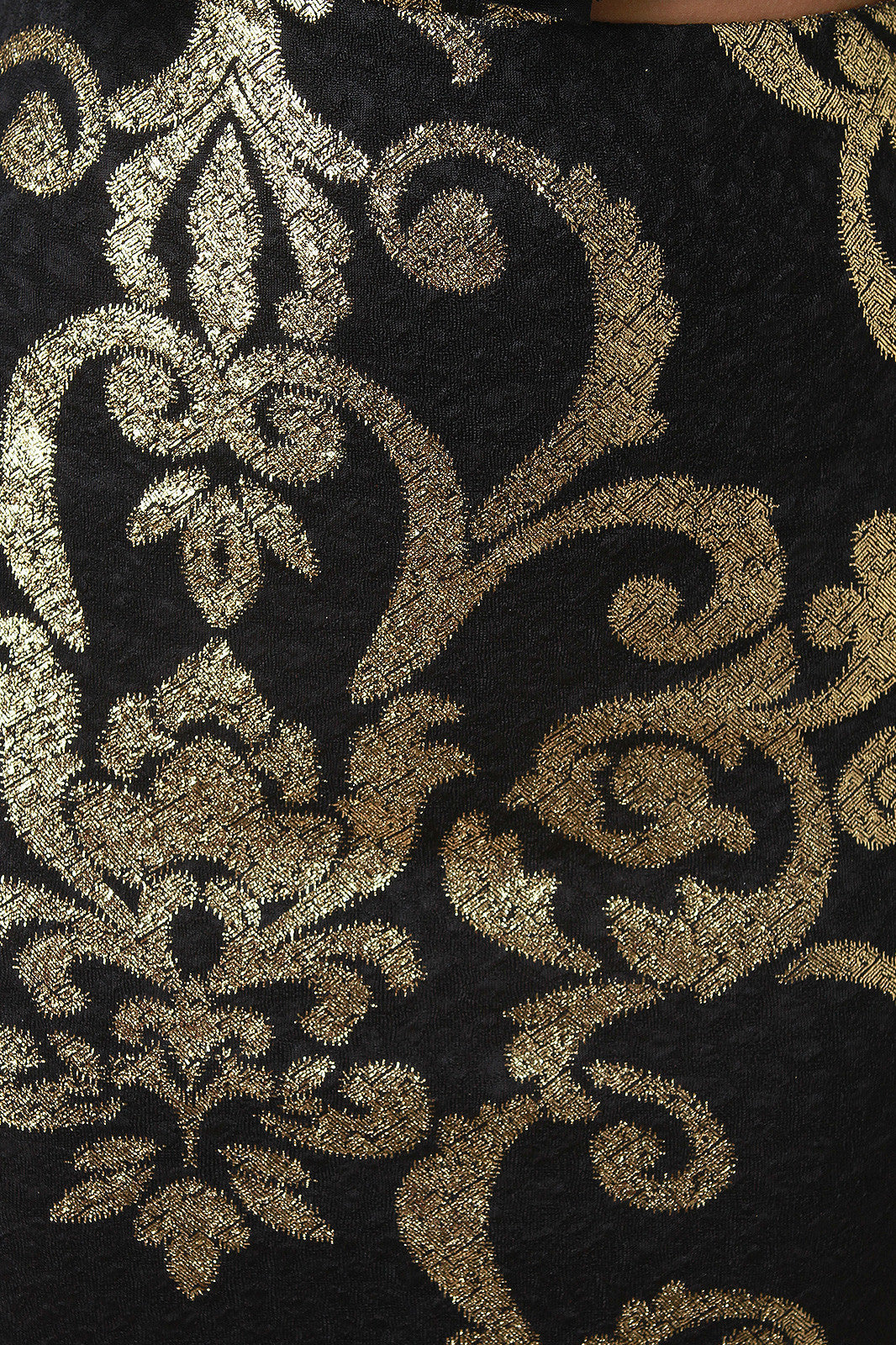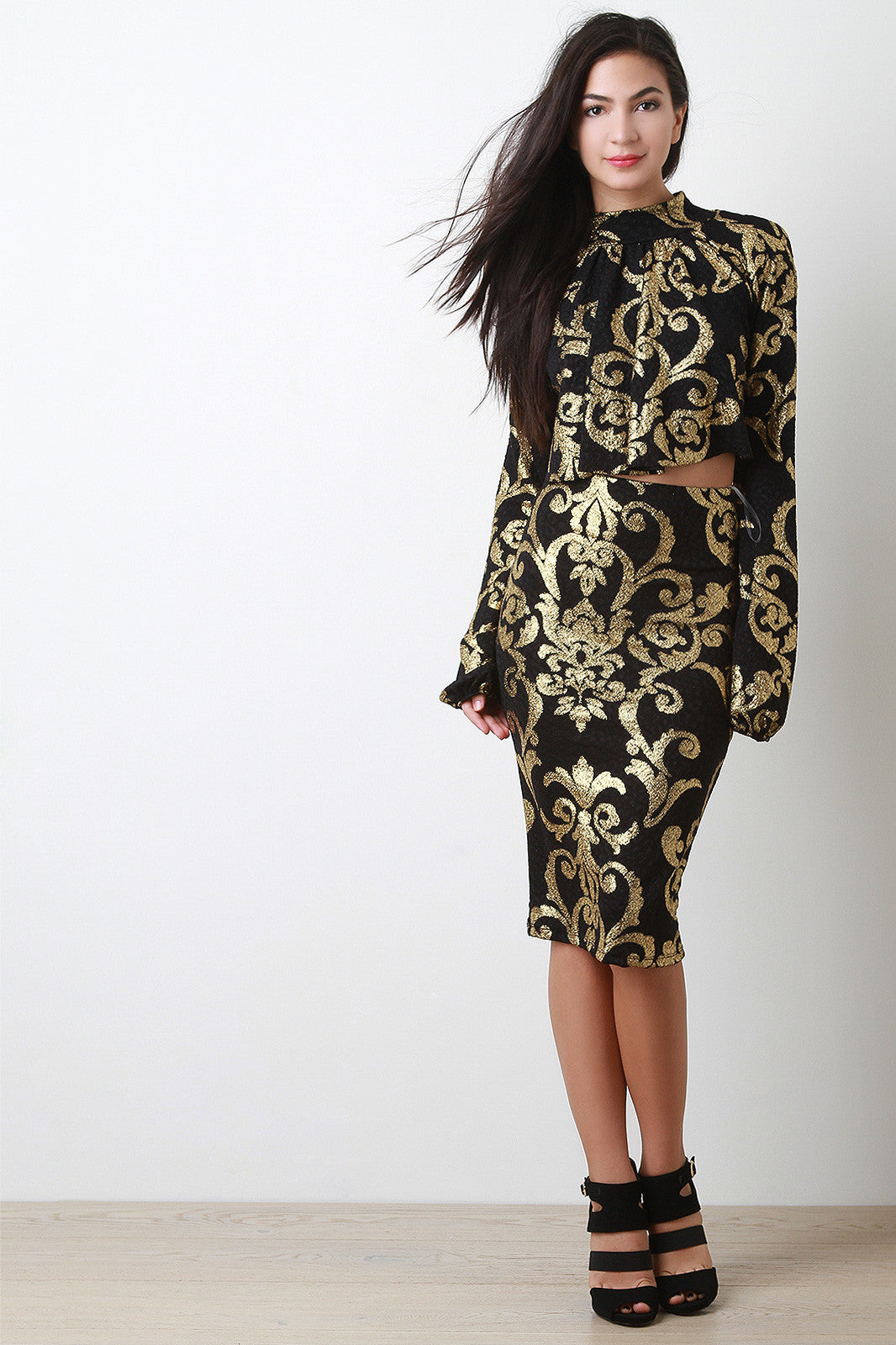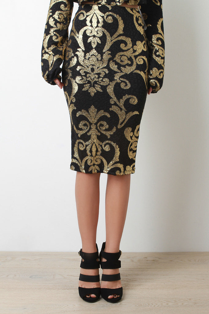 A midi pencil metallic baroque print throughout and an elasticized waistband. Accessories sold separately. Made in U.S.A. 95% Polyester. 5% Spandex.