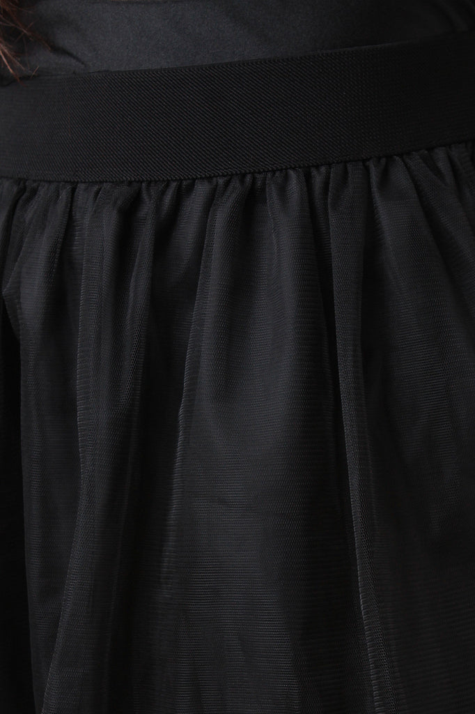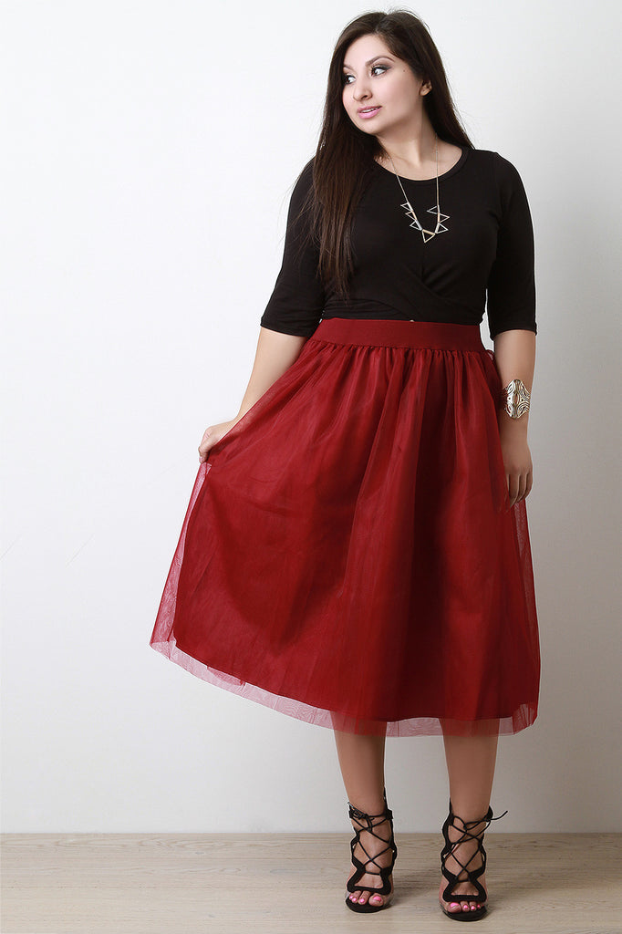 A plus size A-line skirt featuring a mesh overlay gathered at the wide elastic waistband and with a glossy solid fabric underneath. Accessories sold separately. Self: 100% Polyester. Lining: 100% Polyester.