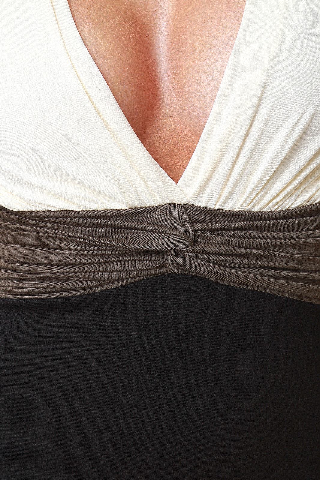 This elongating combo dress features a plunging v-neckline, sleeveless design, ruching accents, contrasting high waisted panel, and sleek black skirt with a high vent slit at left side. Accessories sold separately. Made in U.S.A. 96% Viscose, 4% Spandex. Contrast: 67% Viscose, 28% Nylon, 4% Spandex. Contrast 2: 95% Rayon, 5% Spandex.
