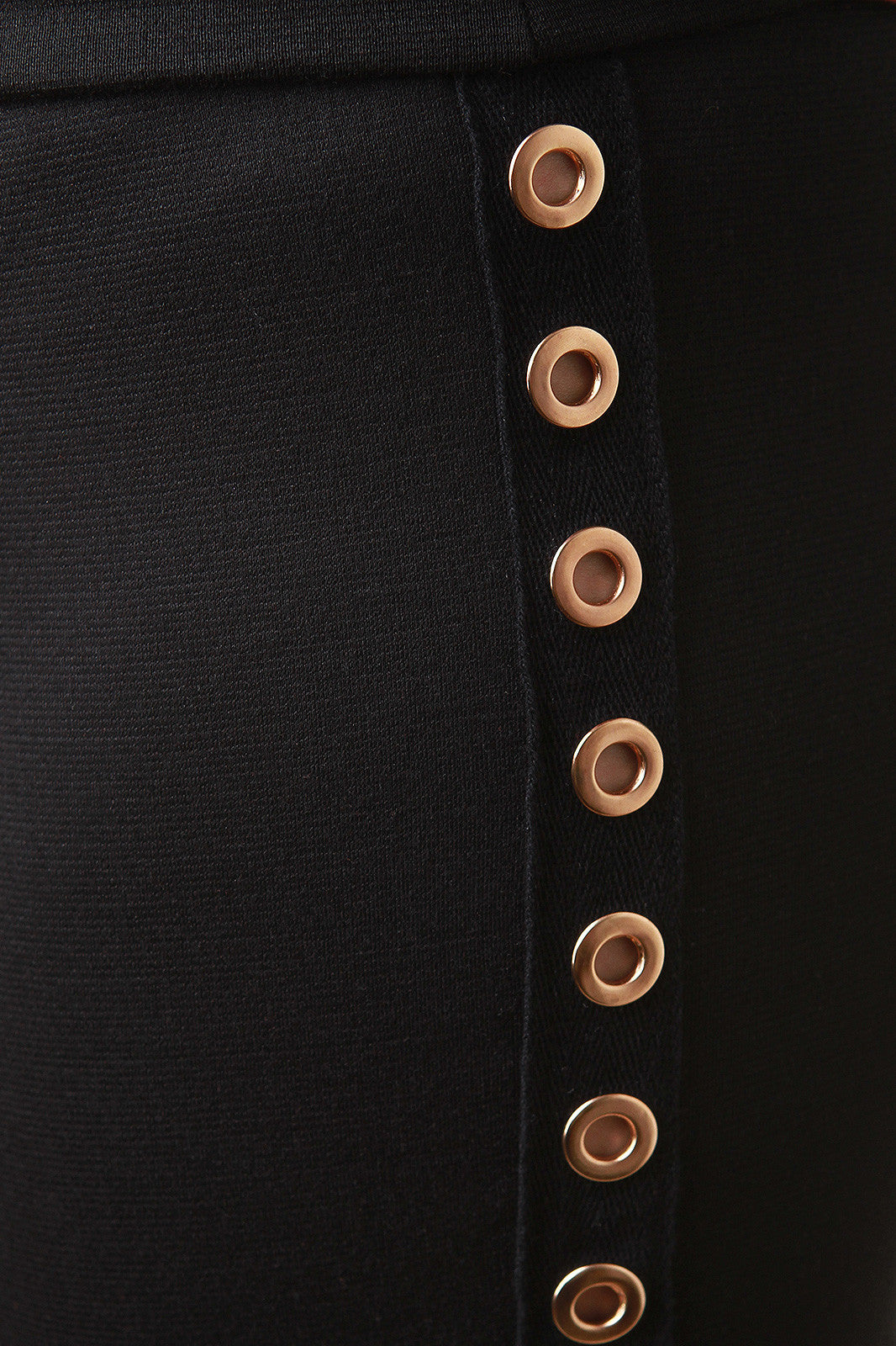 These tight pants features a wide waist seam, taper cut fit, and eyelets hardware along sides. Accessories sold separately. Made in U.S.A. 78% Polyester, 18% Rayon, 3% Spandex.