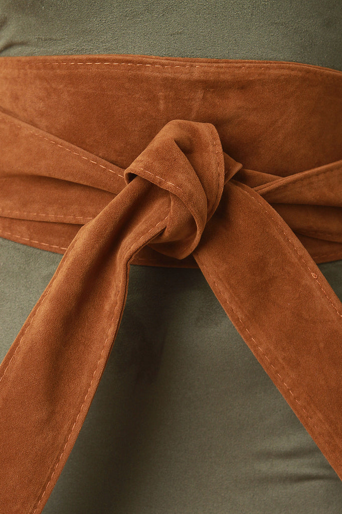 A self-tie obi-style belt in faux suede. To wear, place the widest part at the front and wrap the ends around the waist. Slip one end through the slit and tie a knot at the front and center. One size fits most.