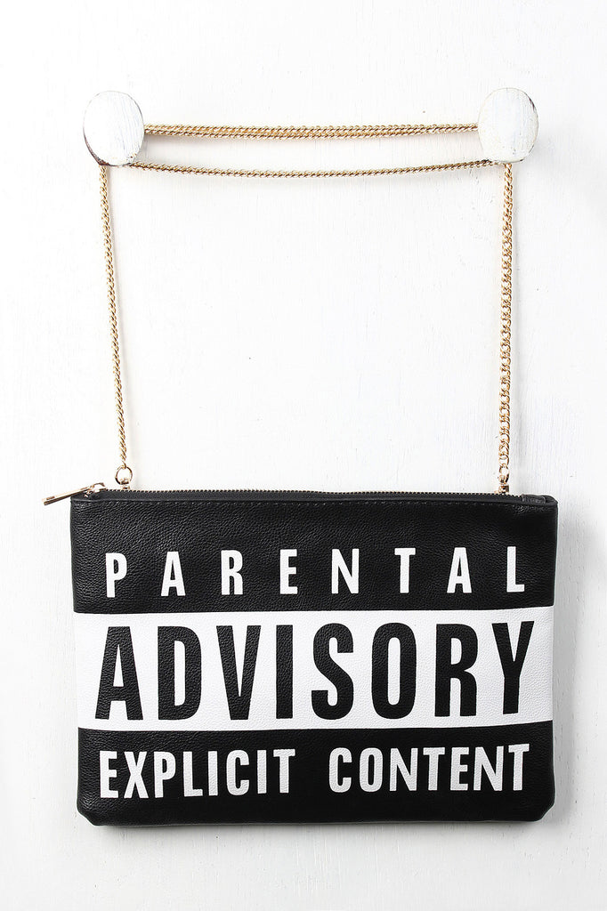 This bold bag features a printed parental advisory warning label on pebbled vegan leather with a top zipper closure and a removable double curb link shoulder chain (23" drop). The interior is fully lined with two slip pockets and one zipper pocket.