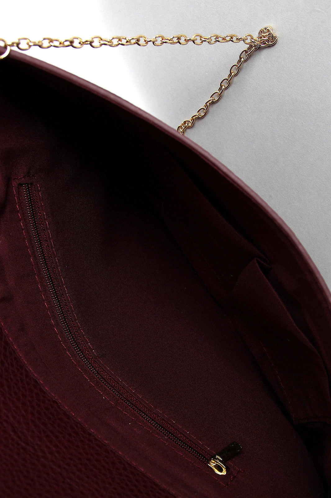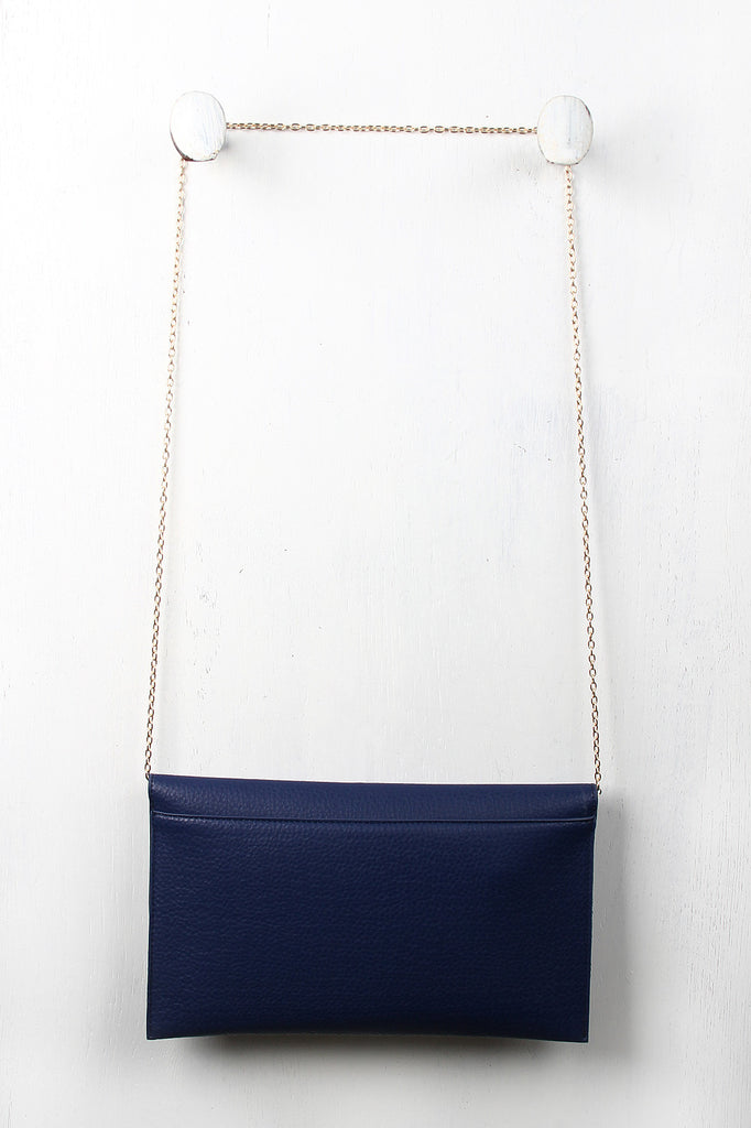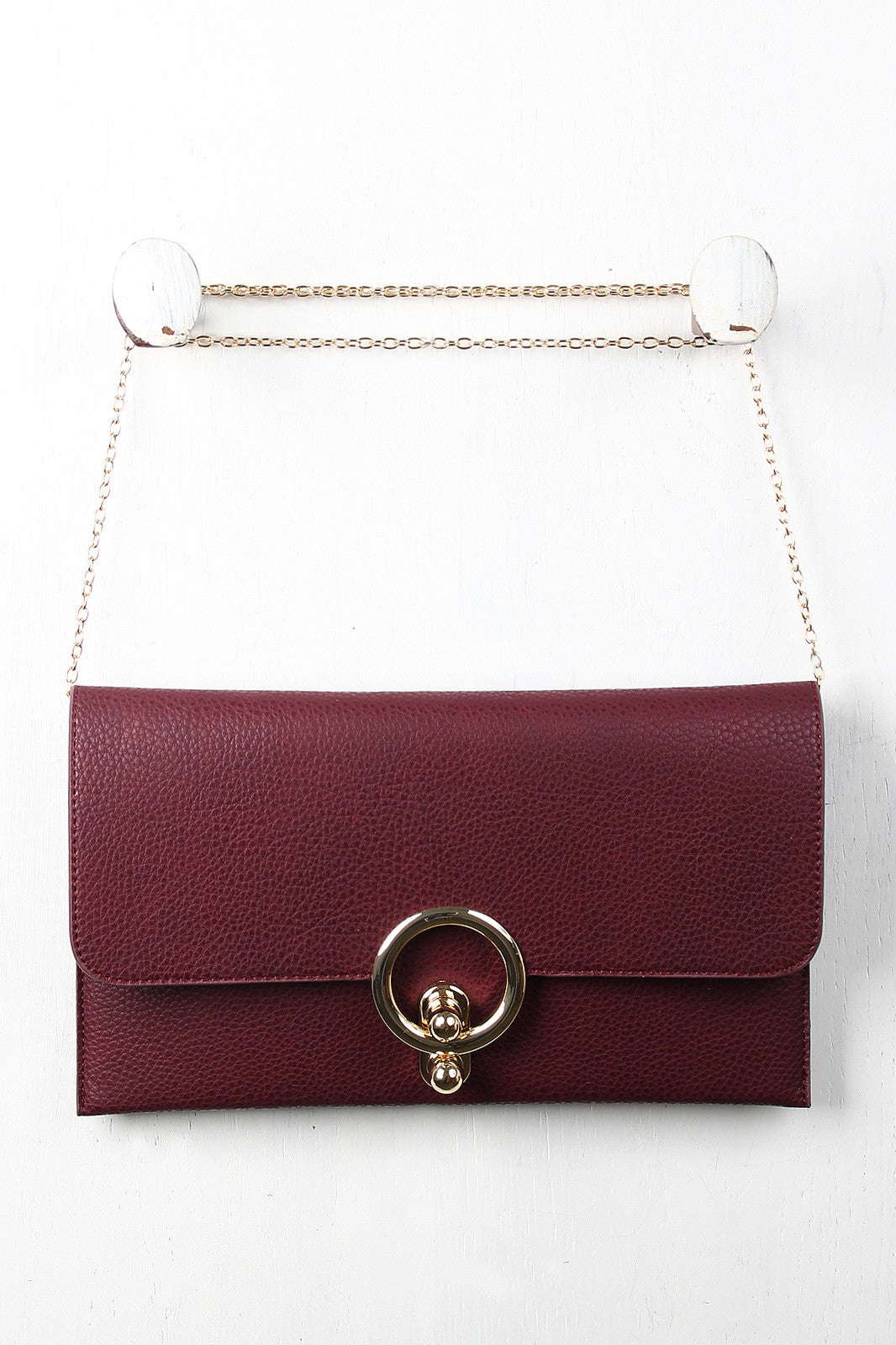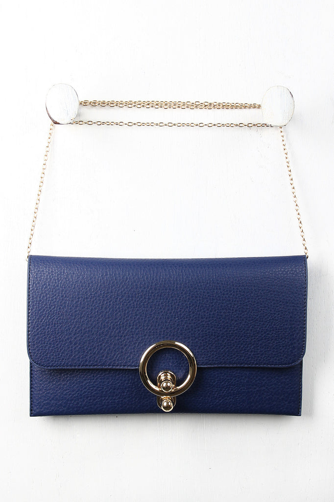 This pebbled vegan leather envelope bag features a unique flap design with a ball knobs spring latch that pinches a glossy metallic ring to keep the flap closed. The bag's interior is fully lined with two slip pockets and one zipper pocket. Includes a detachable curb link chain shoulder strap with a 23" drop.