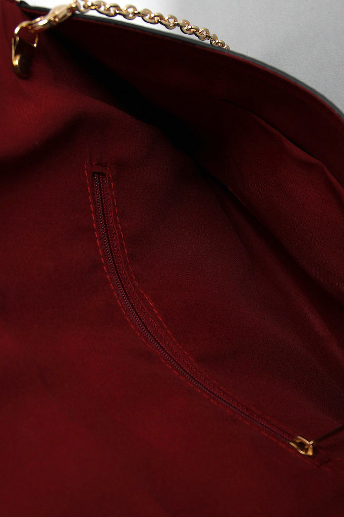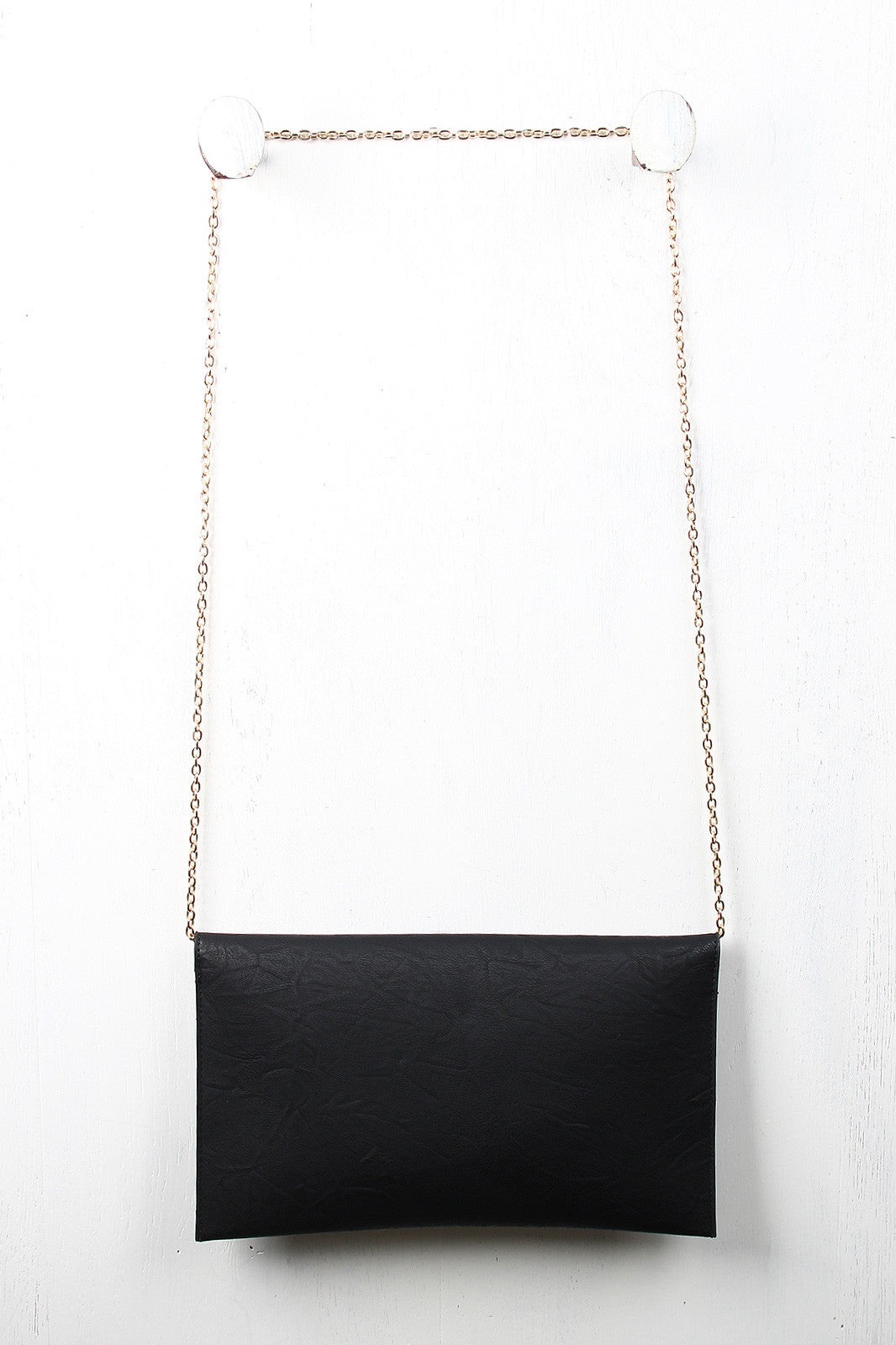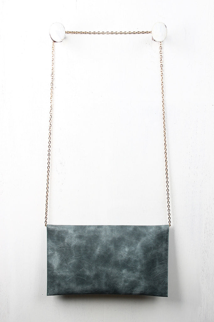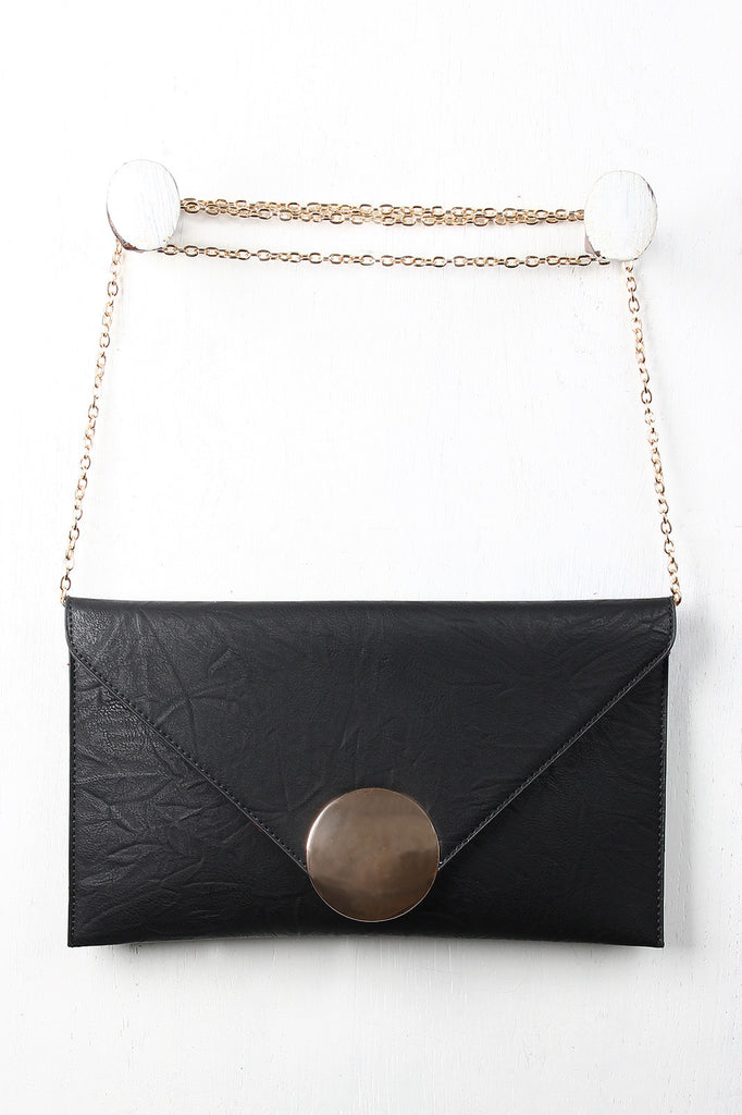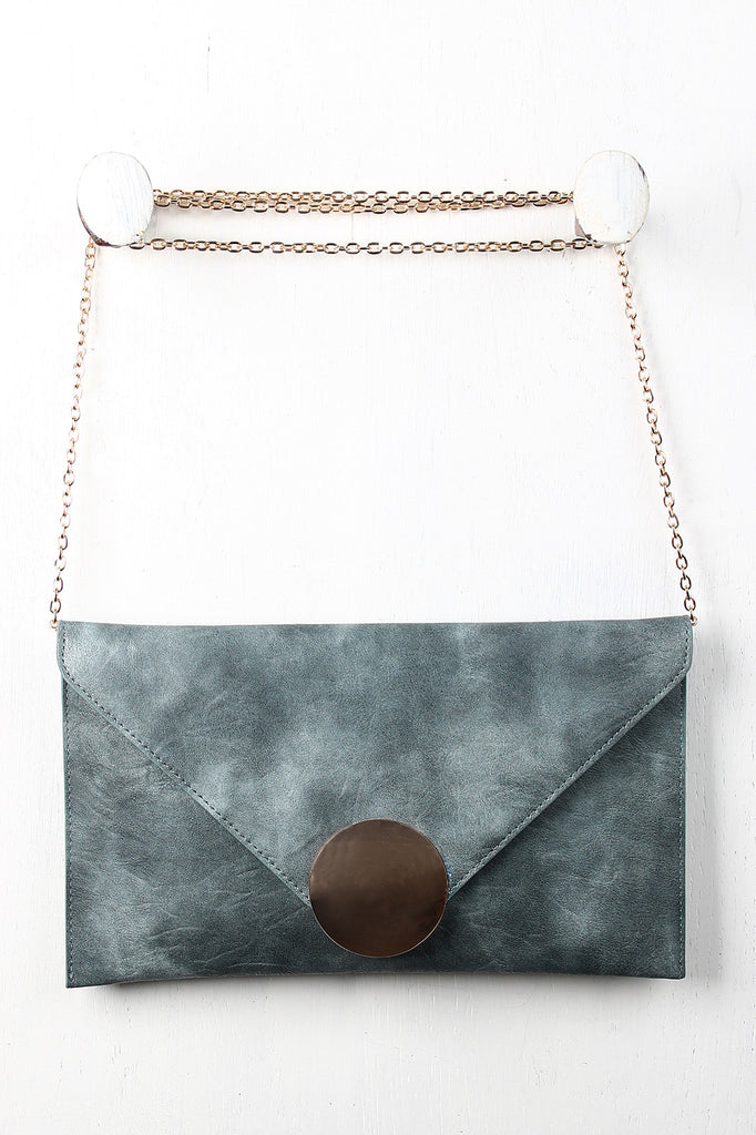 This classy bag features rusty, worn out vegan leather with a round metal embellishment on the front. Has a flap and magnet for closure and a main zippered compartment in the inside with a detachable curb link chain shoulder strap with a 22" drop.