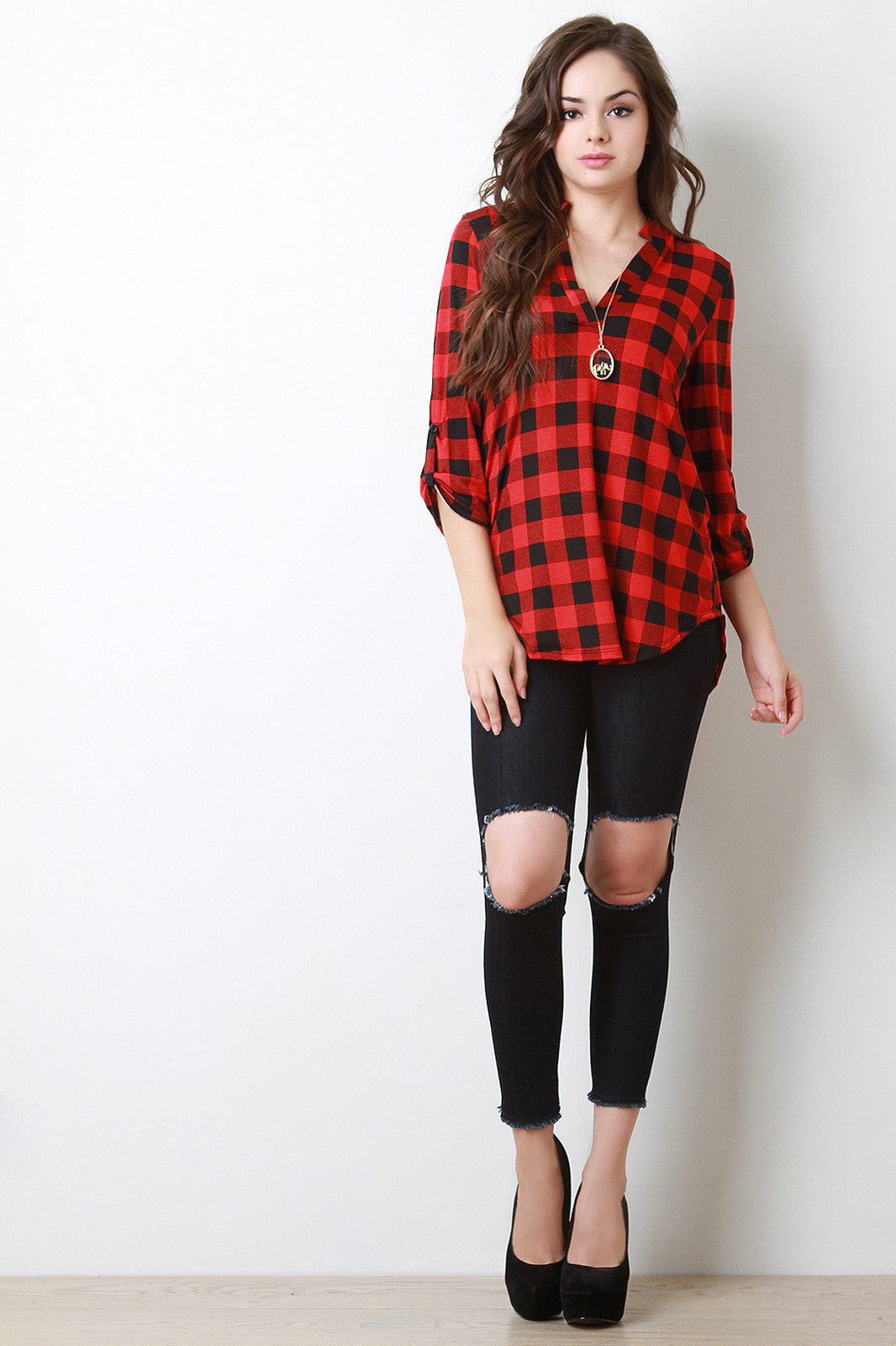 Plaid Pattern Split V-Neck Long Roll Sleeves Top