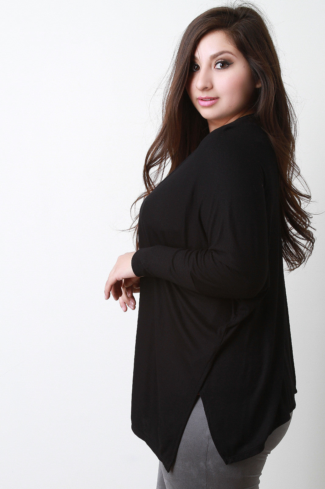 This plus size cardigan features a stretchy knit fabrication, draped open front construction, long dolman sleeves design, and finished with side slits detail. Accessories sold separately. Made in U.S.A. 96% Rayon, 4% Spandex.