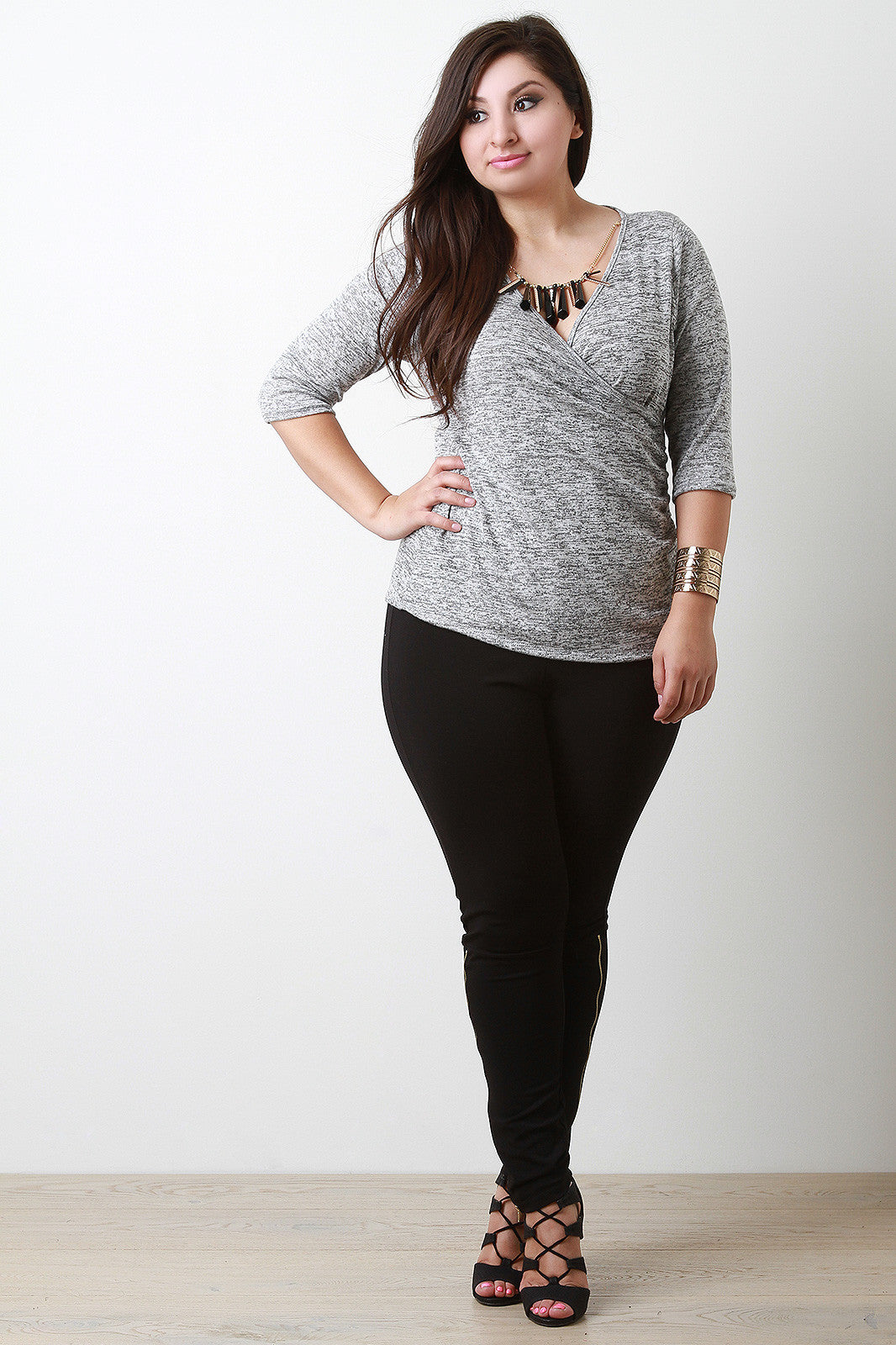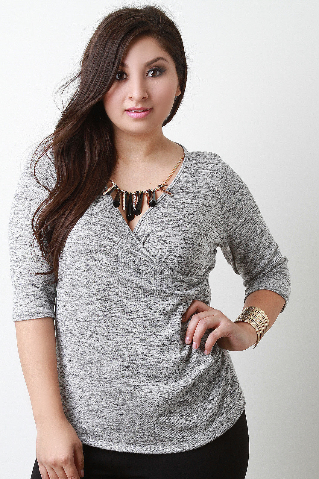 This plus size top, features a surplice neckline and quarter sleeves. Heathered design. Necklace is included and can be detached. Other accessories sold separately. 49% Rayon. 47% Polyester. 4% Spandex.