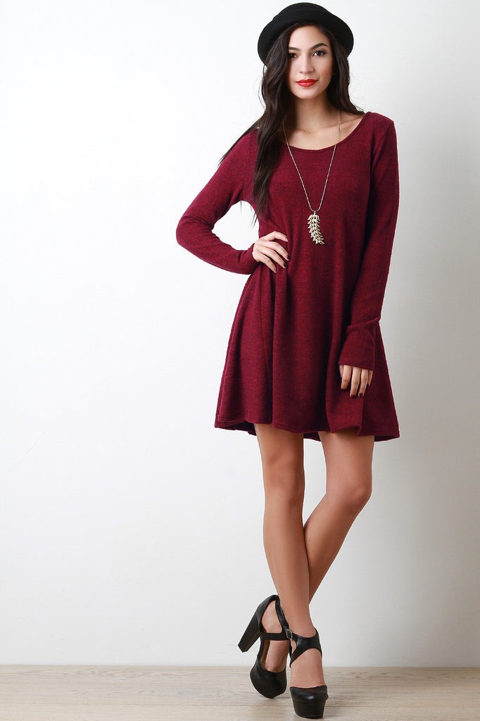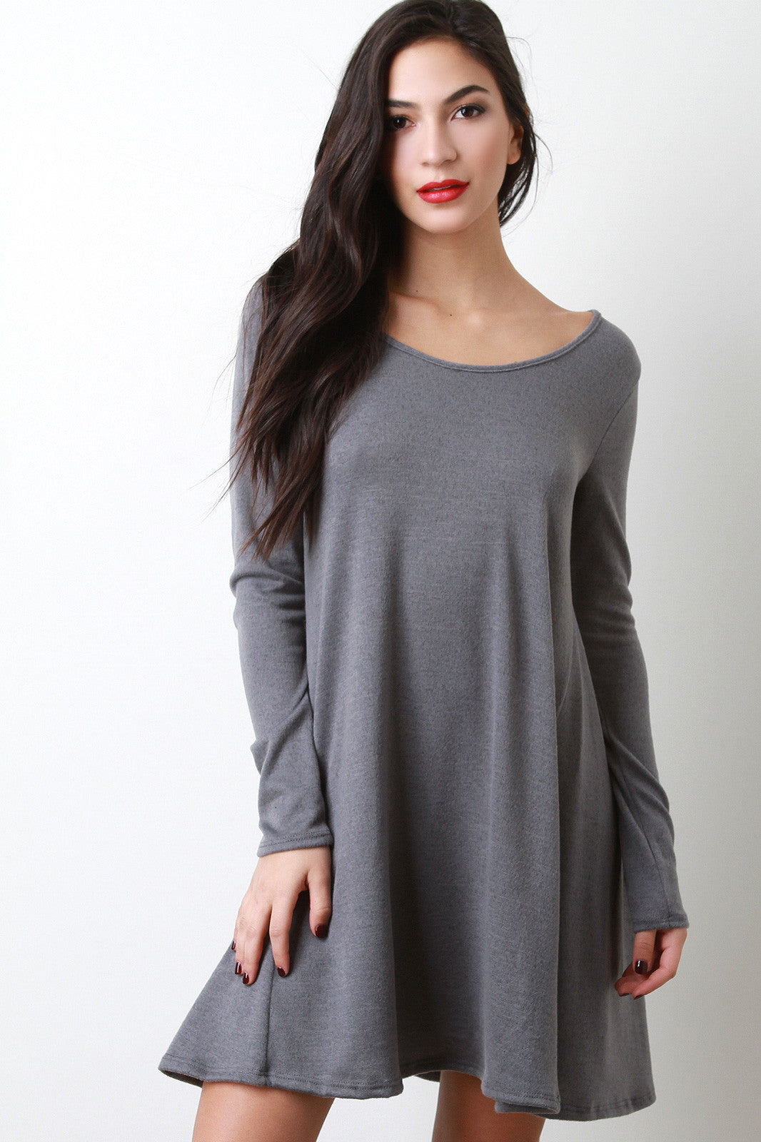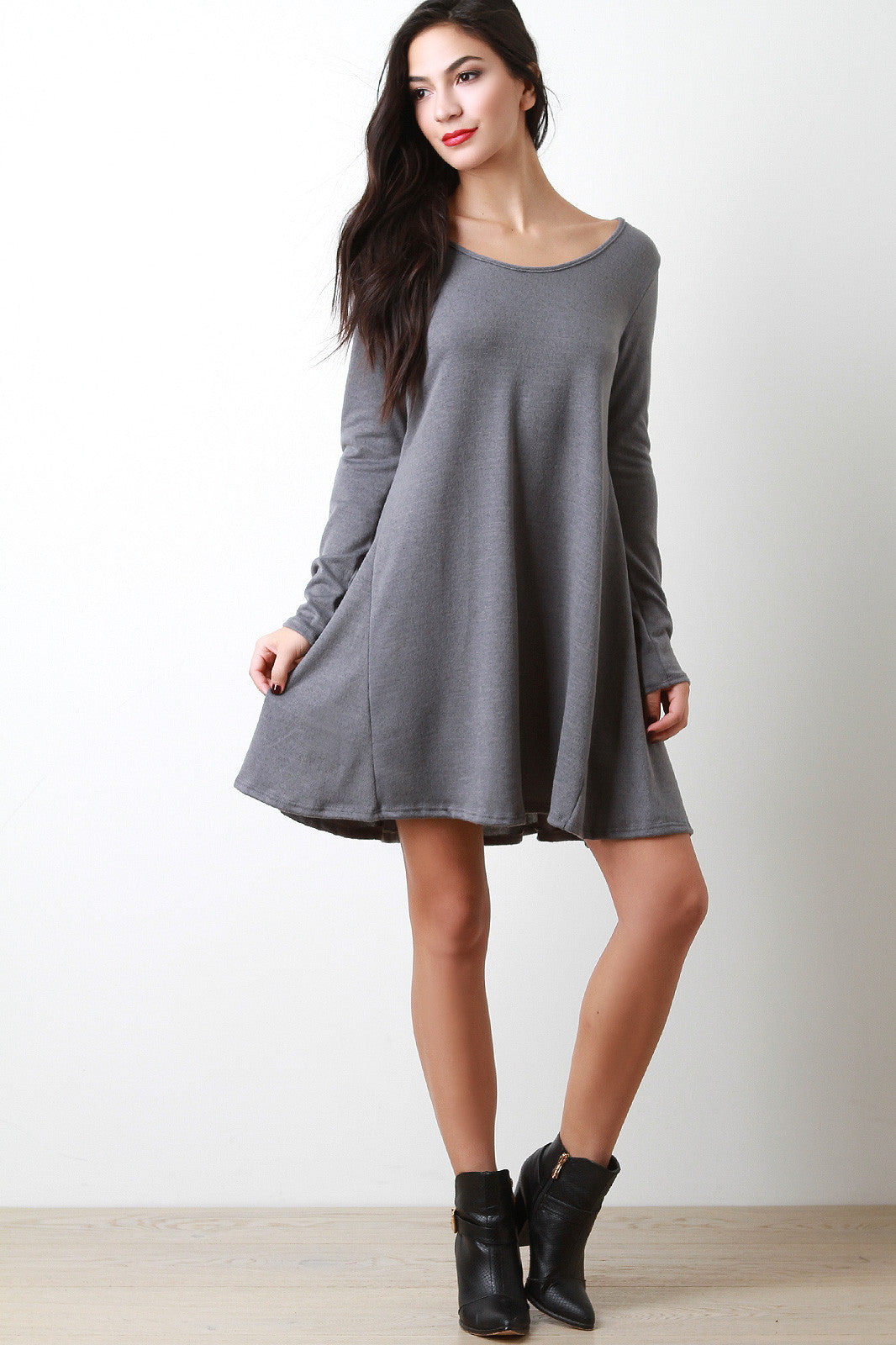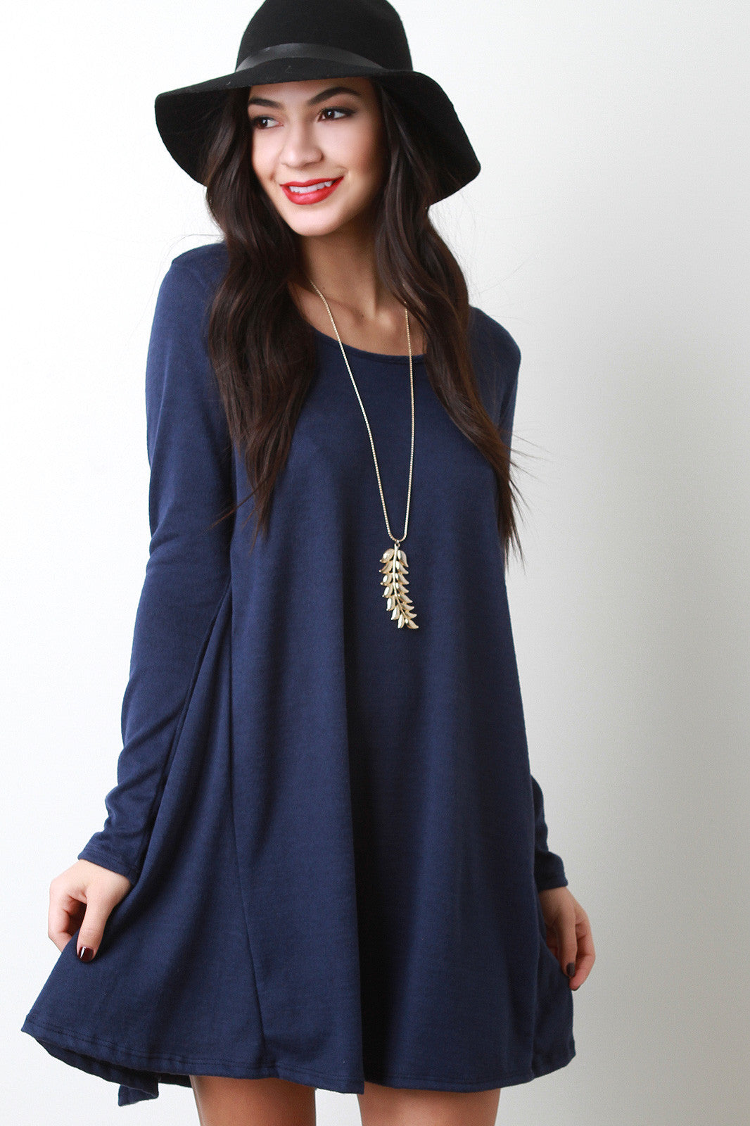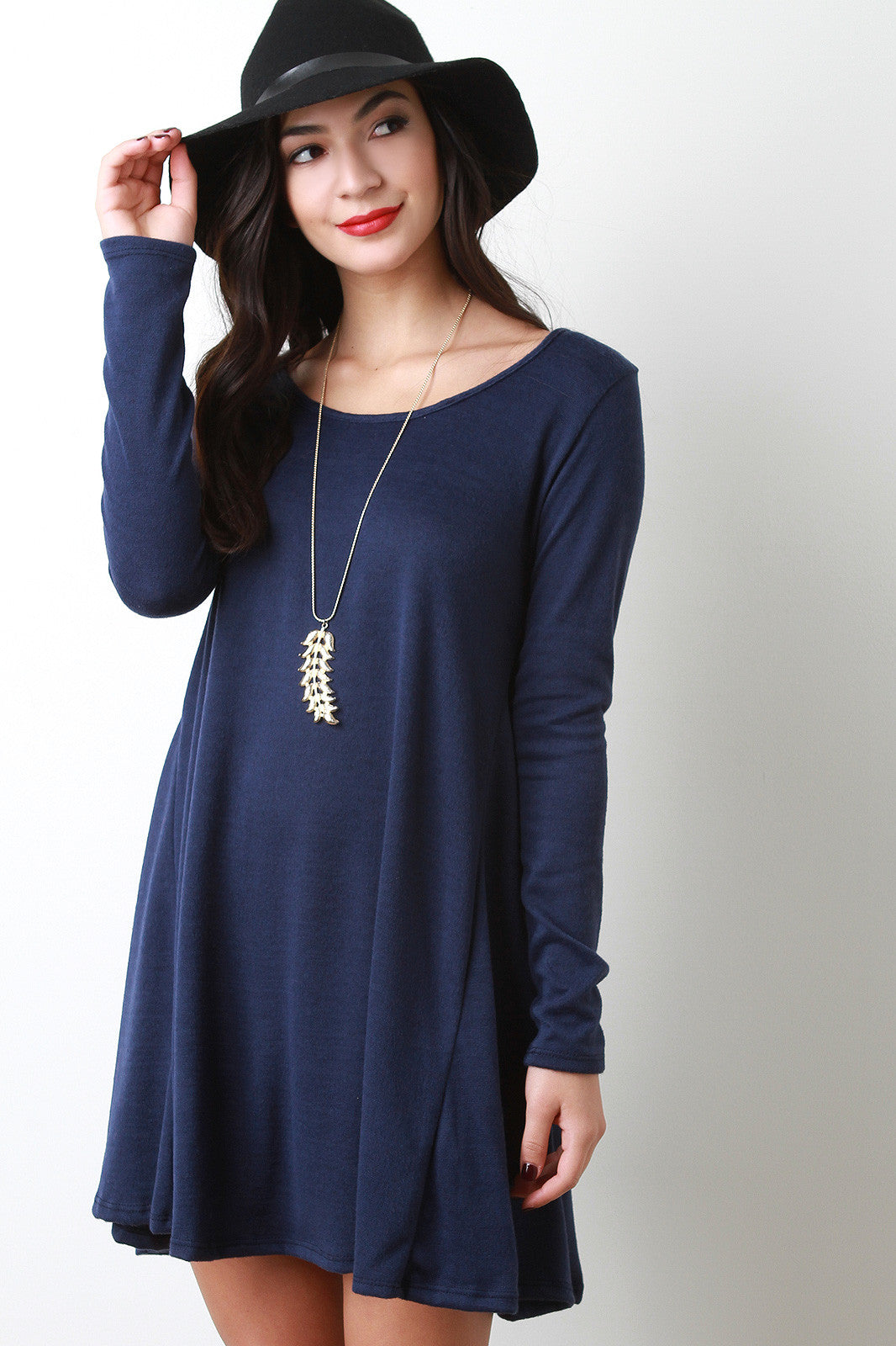 This shift dress features a round neckline, long sleeves, and a soft knit finish. Accessories sold separately. Made in U.S.A. 95% Polyester, 5% Spandex.