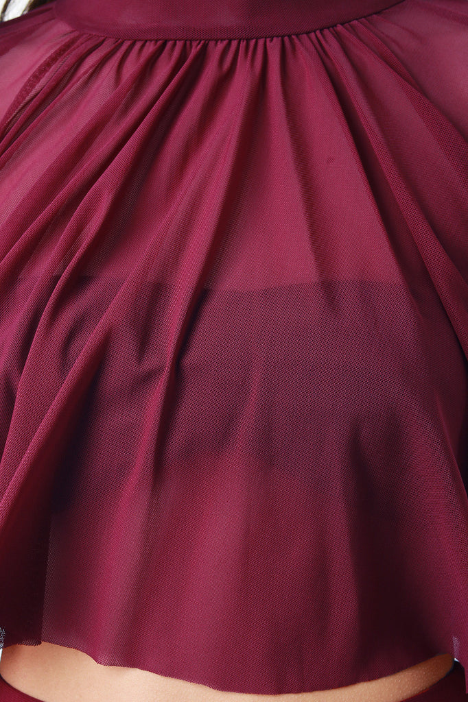 This semi-sheer mesh top features a cape design, mock neckline with a self-tie bow at nape to an open back, long sleeves, and cropped hemline. Accessories sold separately. Made in U.S.A. 100% Polyester.