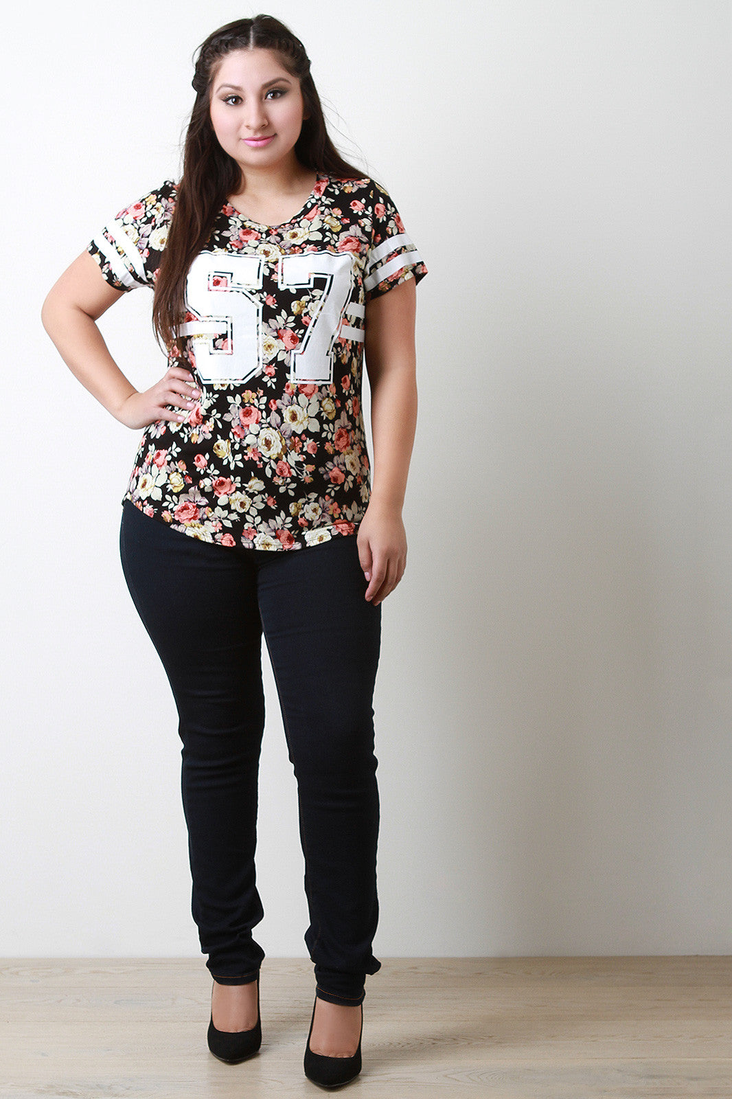 This plus size tee features a round neckline, short sleeves, rounded hemline, floral print throughout, and jersey inspired 57 screen print at front. Accessories sold separately. Made in U.S.A. 97% Rayon, 3% Spandex.