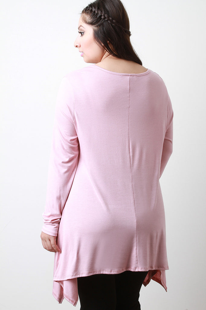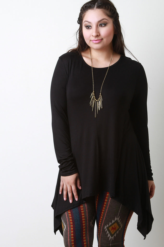 This relaxed fit plus size top features a round neckline, long sleeves, and a handkerchief hemline. Finished with a center seam design on the front and back. Accessories sold separately. Made in U.S.A. 95% Rayon, 5% Spandex.