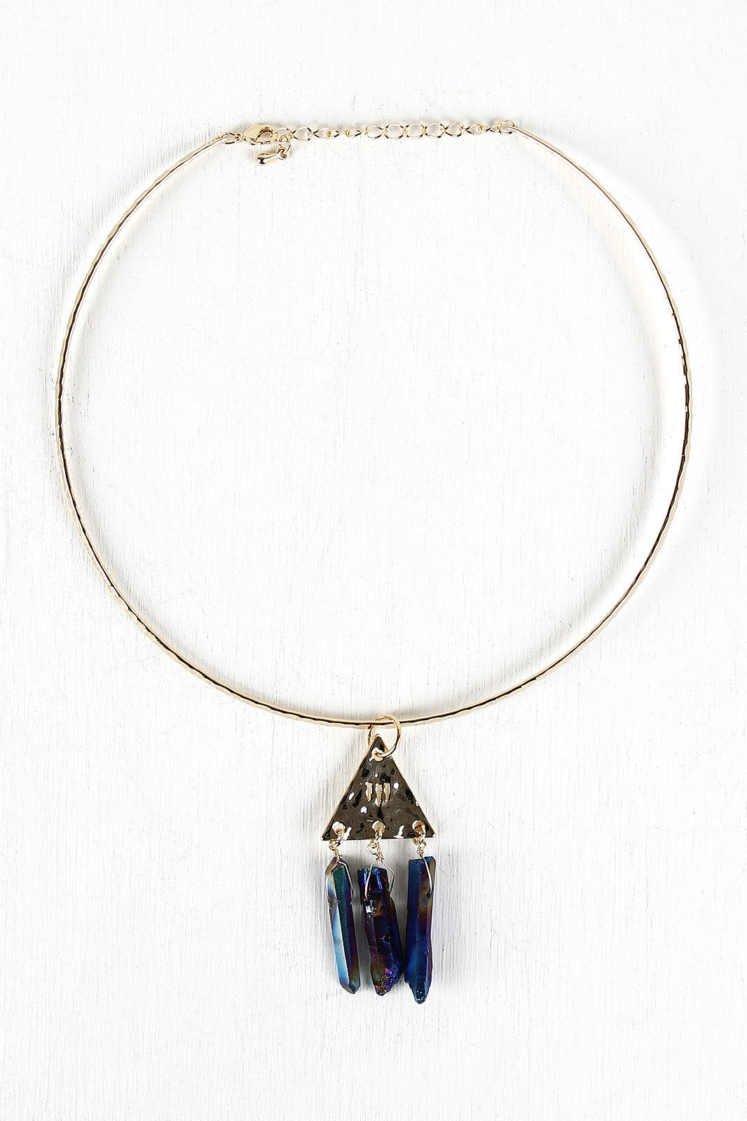 A boho-chic choker featuring a glossy hammered wire band, triangle pendant with three cutout hash marks, and iridescent quartz charms. Finished with an adjustable lobster hook closure.