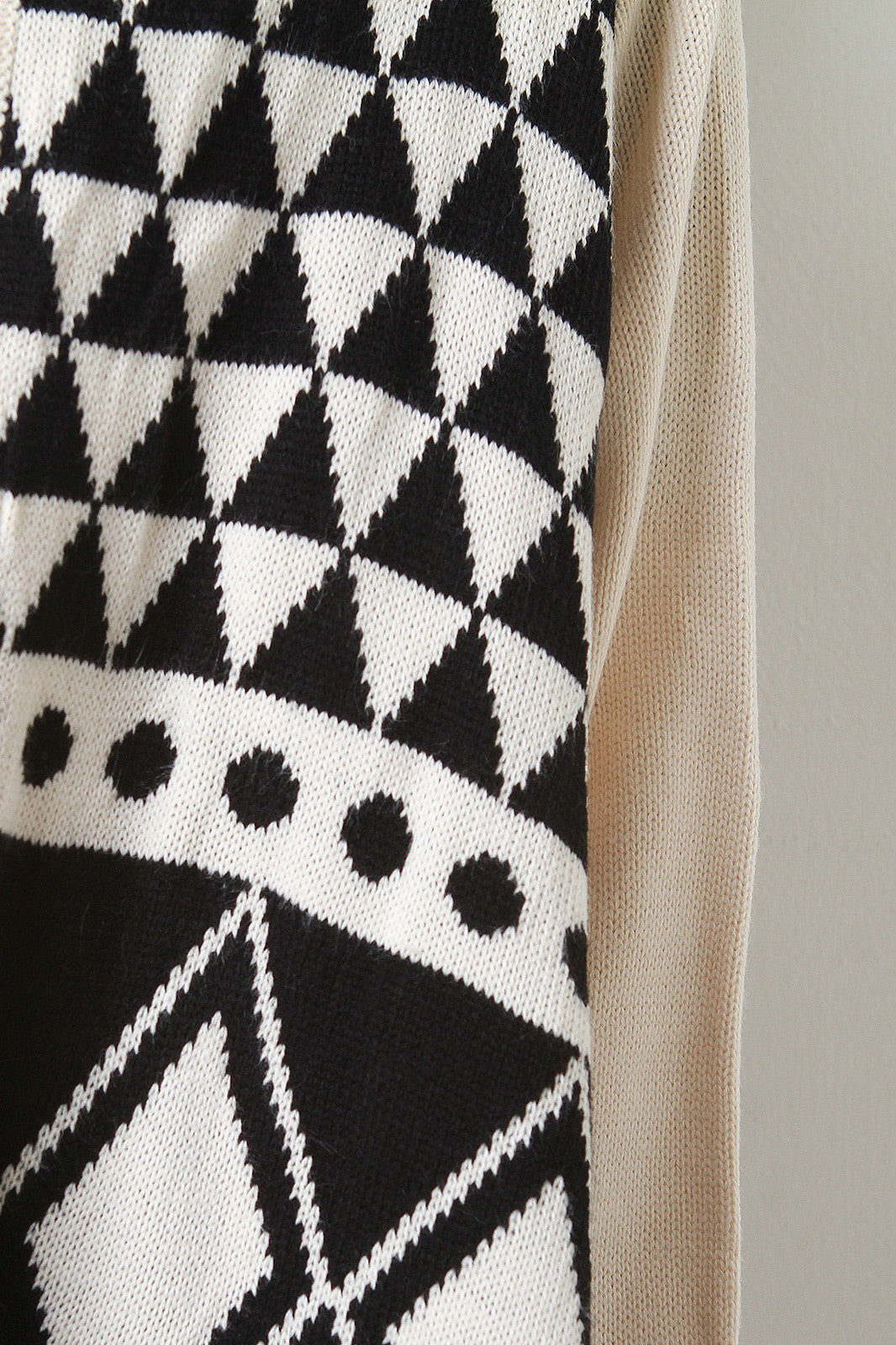 This stylish cardigan features a geometric knit patterns, open front design, long wide sleeves, and a handkerchief hemline. Accessories sold separately. 89% Acrylic, 11% Wool.