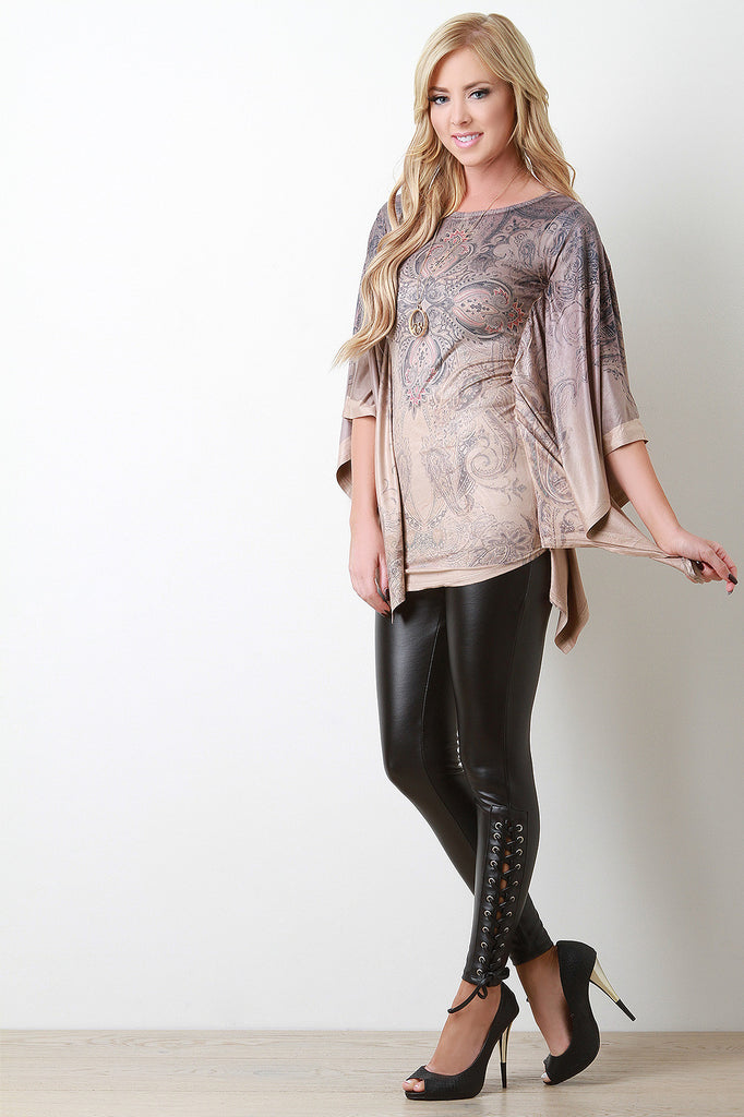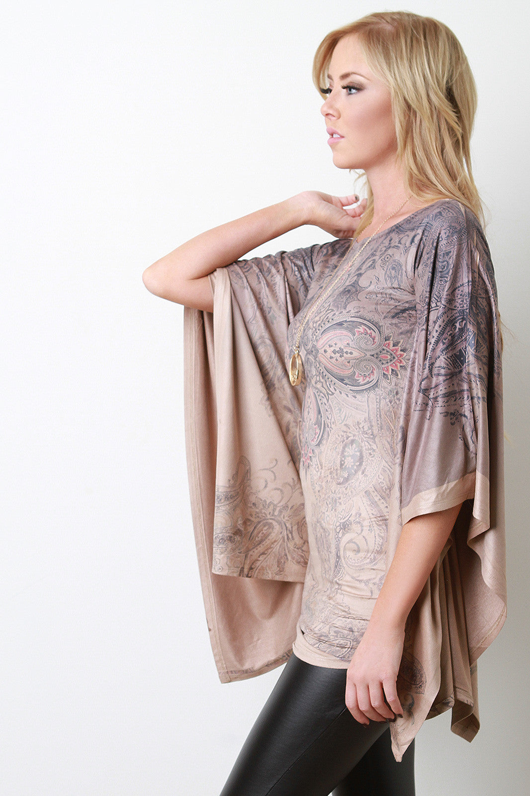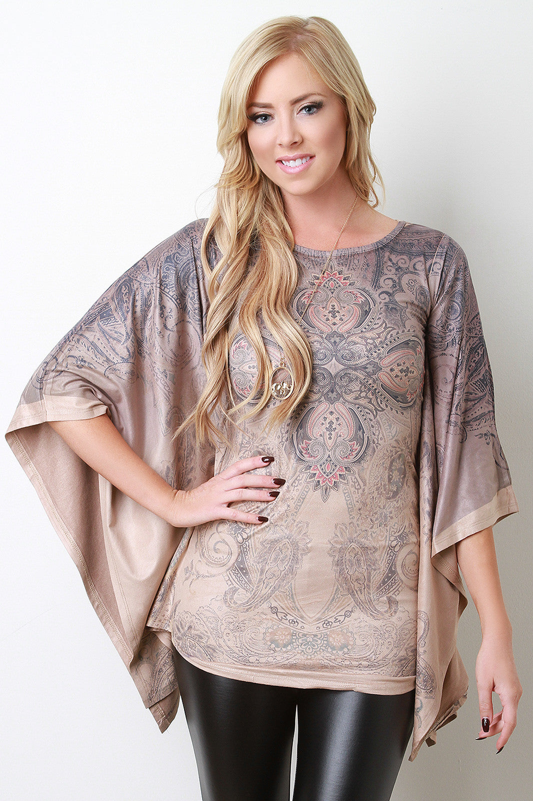 This top features a faux suede knit fabrication with a paisley imprinted pattern, a round neckline, and three quarter length sleeves with a butterfly design. Accessories sold separately. Made in U.S.A. 95% Polyester, 5% Spandex.