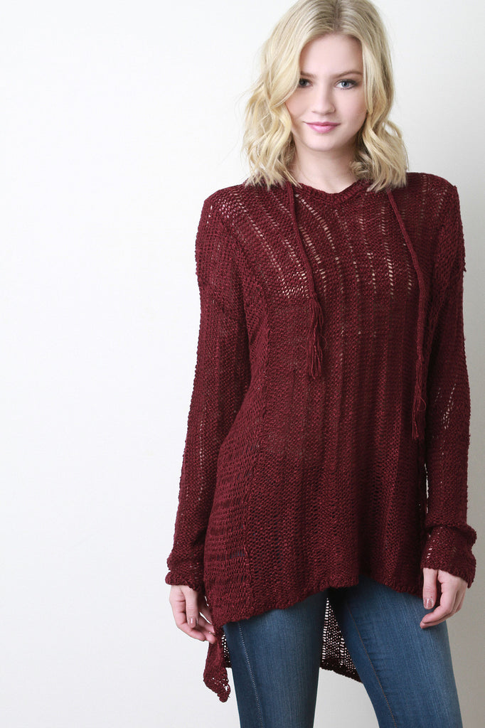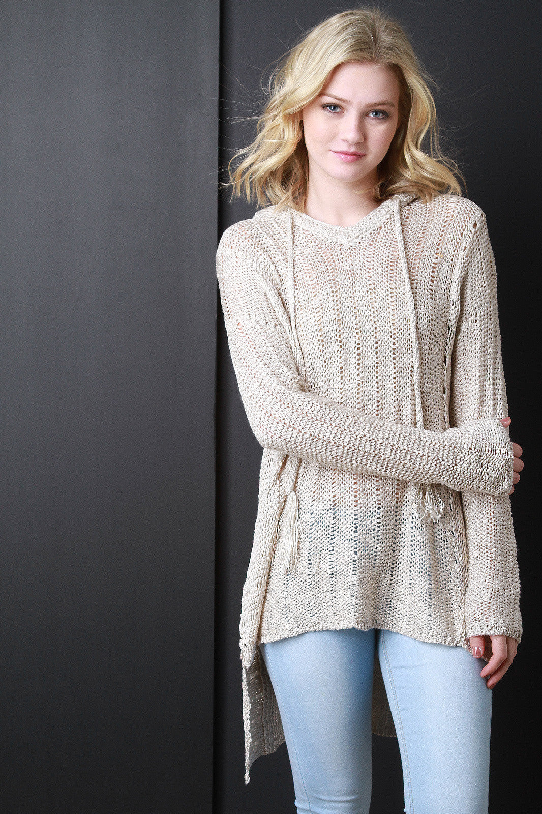 This relaxed fit hoodie features a semi-sheer loose knit, drawstrings with tassel ends, long sleeves, and a high-low hemline. Accessories sold separately. 65% Acrylic, 20% Polyester, 15% Nylon.