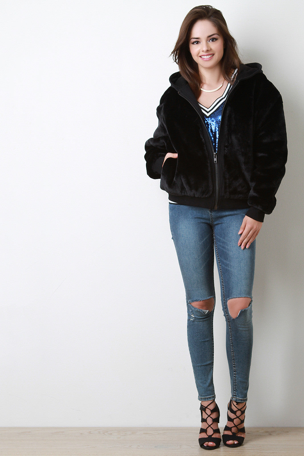 This faux fur , a jersey knit hood, and long sleeves. Finished with a front zipper closure, ribbed elastic hems, and satin interior lining. Accessories sold separately. 100% Polyester.