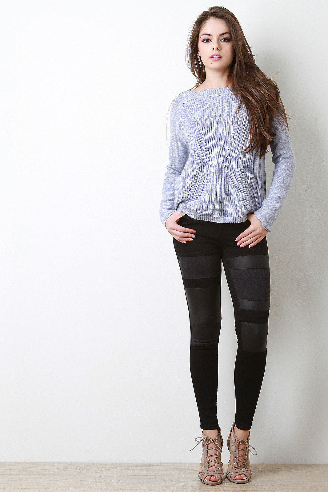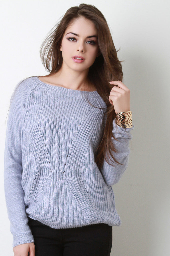 This top features a loose fit with a mixture of a diagonal ribbed knit fabrication and a round neckline. Accessories sold separately. 58% Viscose, 25% Polyester, 13% Nylon, 4% Angora.