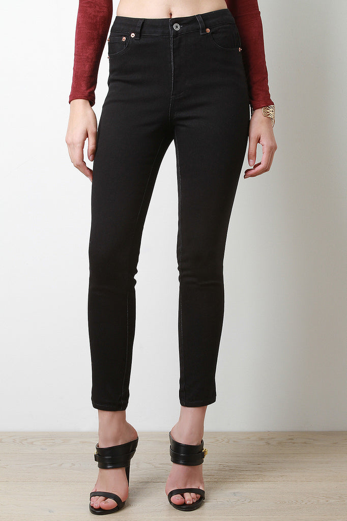 These denim jeans features a high rise waist, taper cut legs, classic 5-pockets design, belt loops, zipper fly and a single button closure. Accessories sold separately. 75% Cotton, 23% Polyester, 2% Spandex.